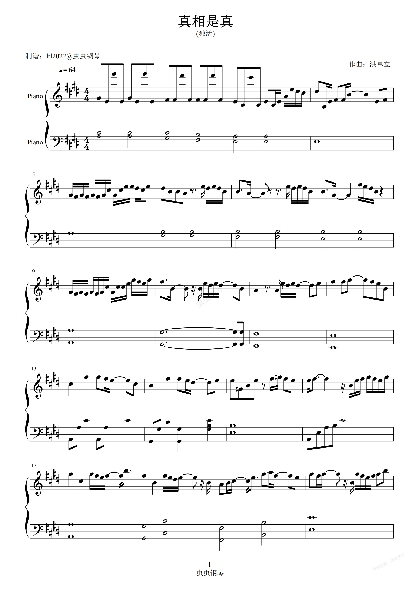 钢琴谱:真相是真-阿鸣-独奏版-五线谱-洪卓立-独活