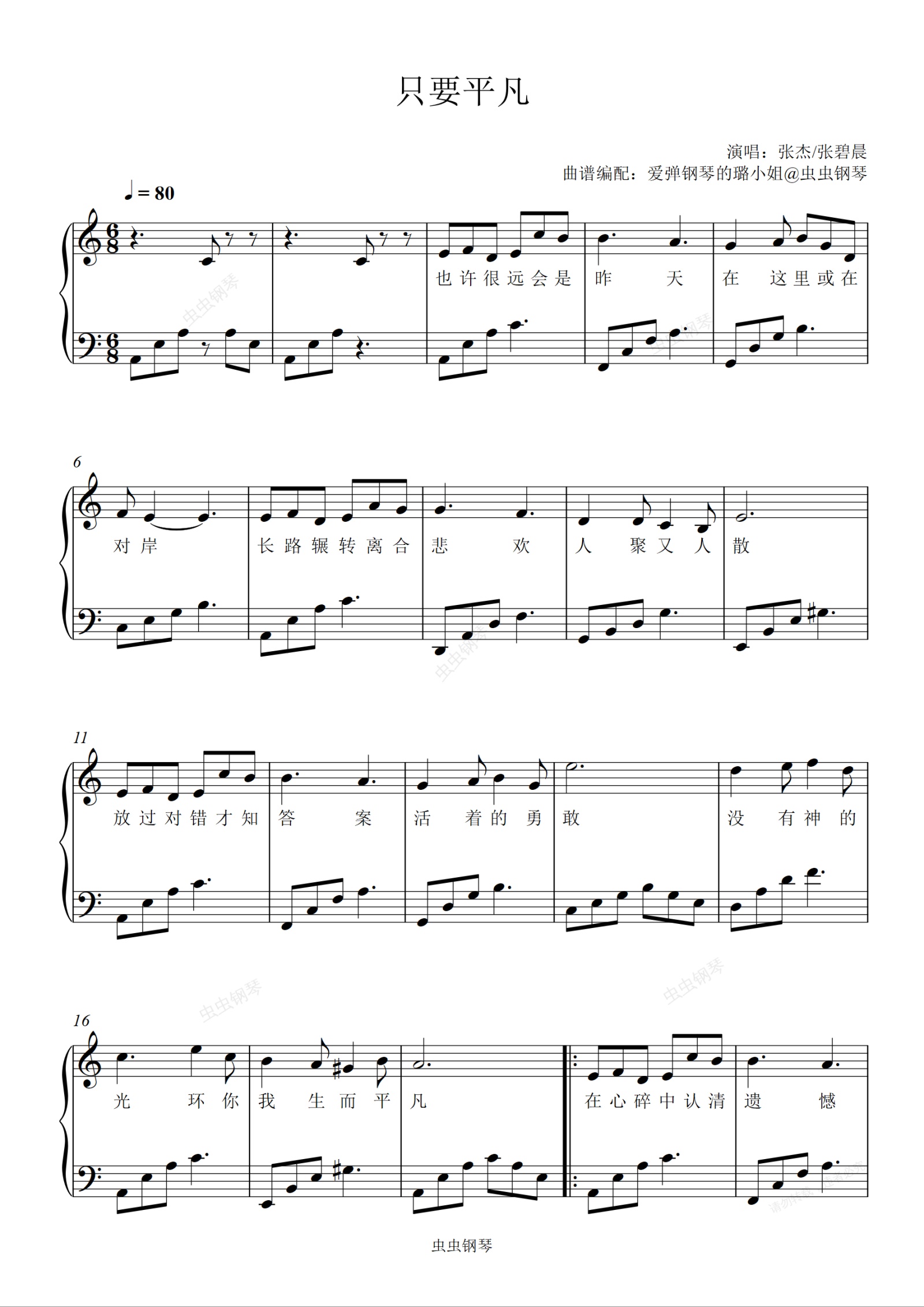 钢琴谱:只要平凡 - (无删减)C调简单版 - 附歌词