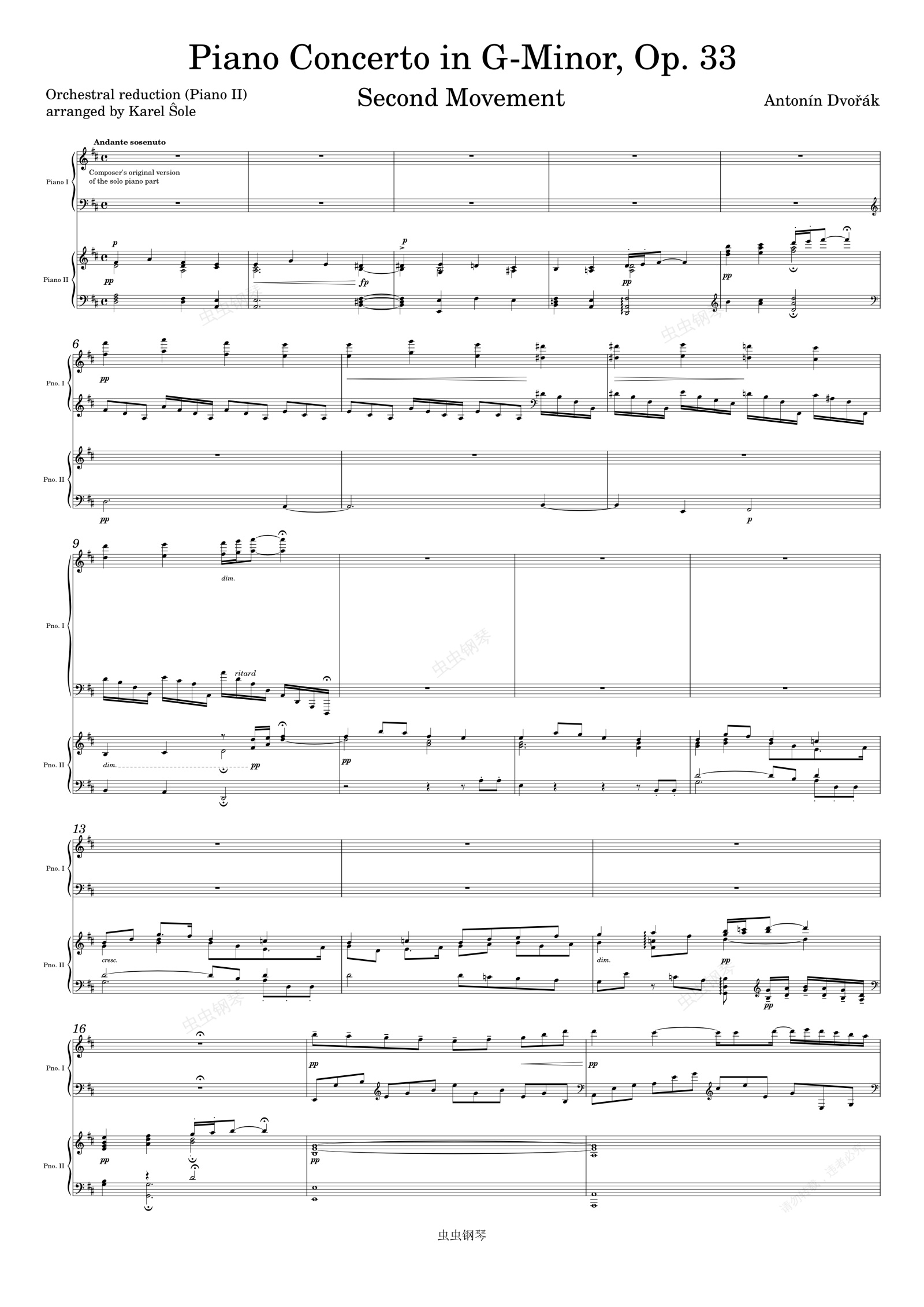 钢琴谱:Dvořák Piano Concerto in G Minor, 2nd Mvmt (arr. for 2 pianos)