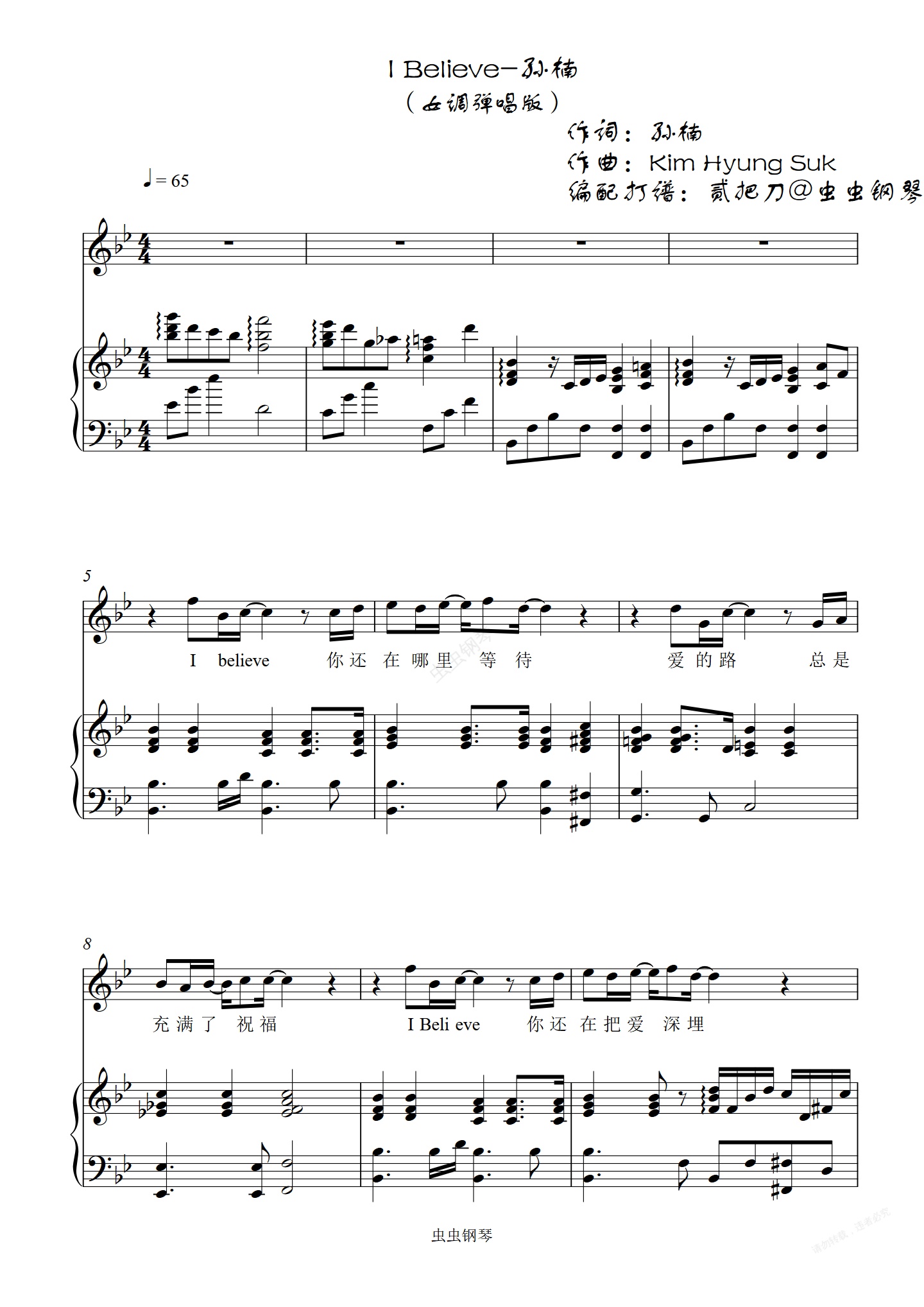 钢琴谱:I Believe女调版弹唱