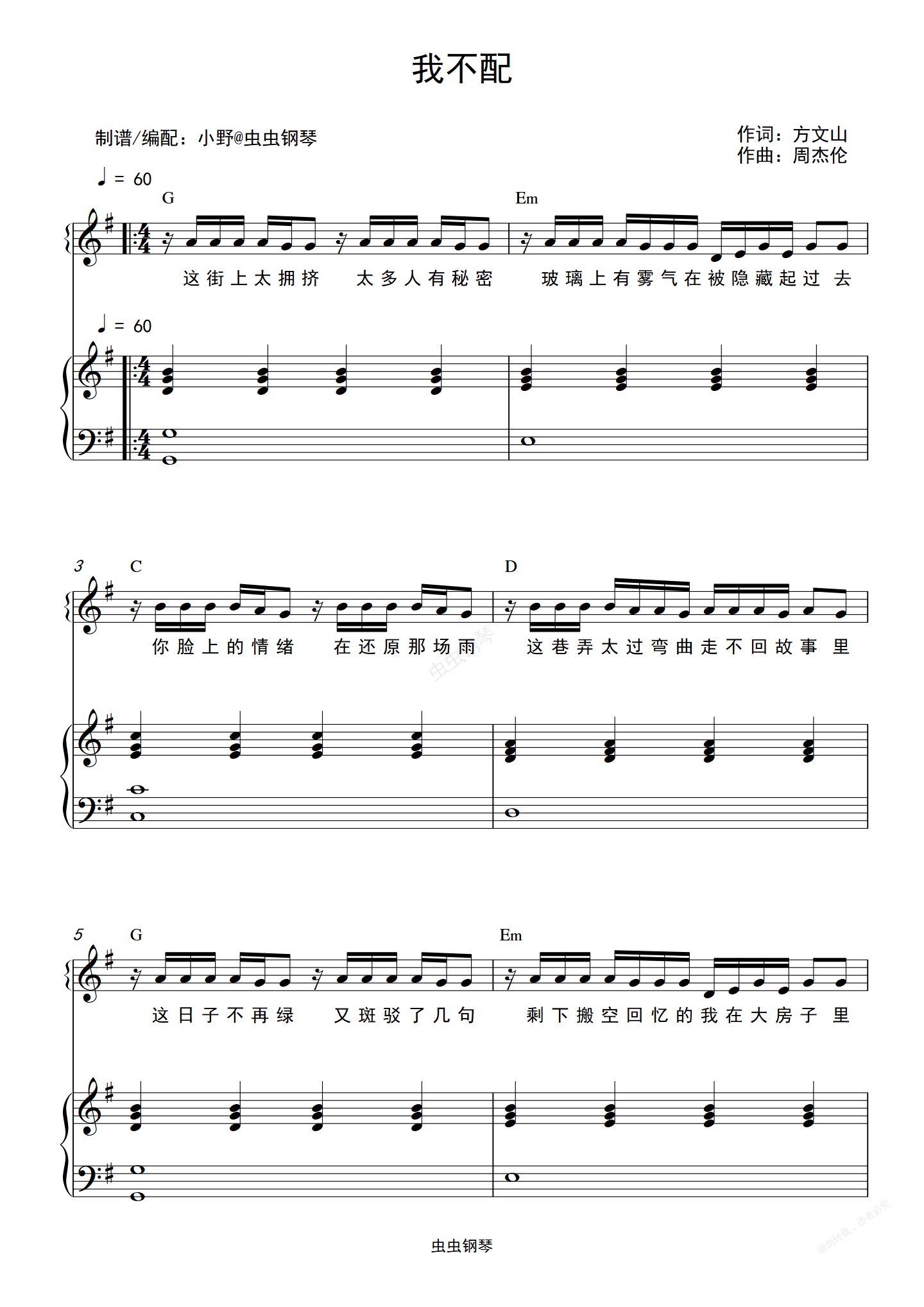 钢琴谱:我不配(和弦弹唱版)