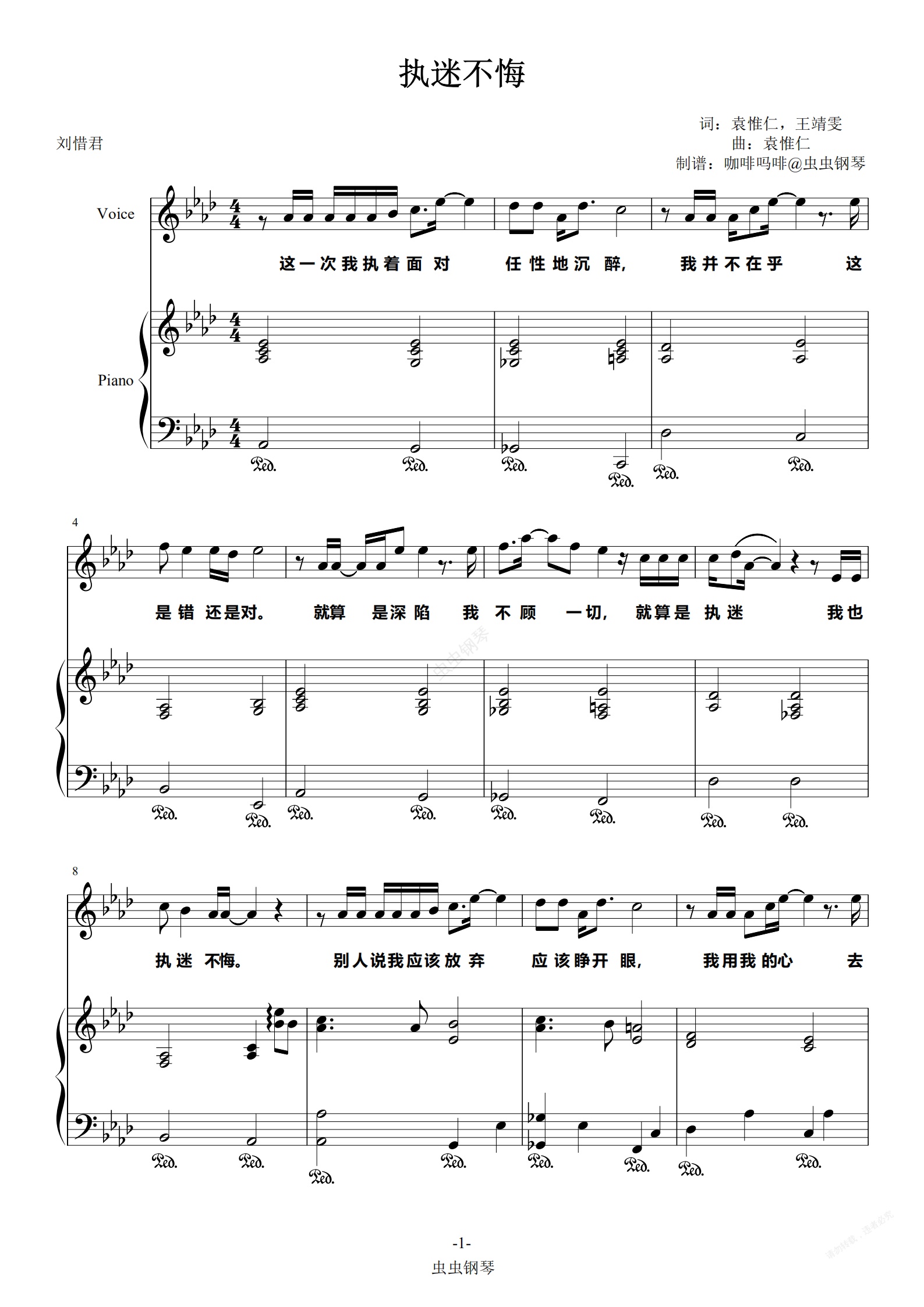 钢琴谱:执迷不悔-刘惜君 原调弹唱谱