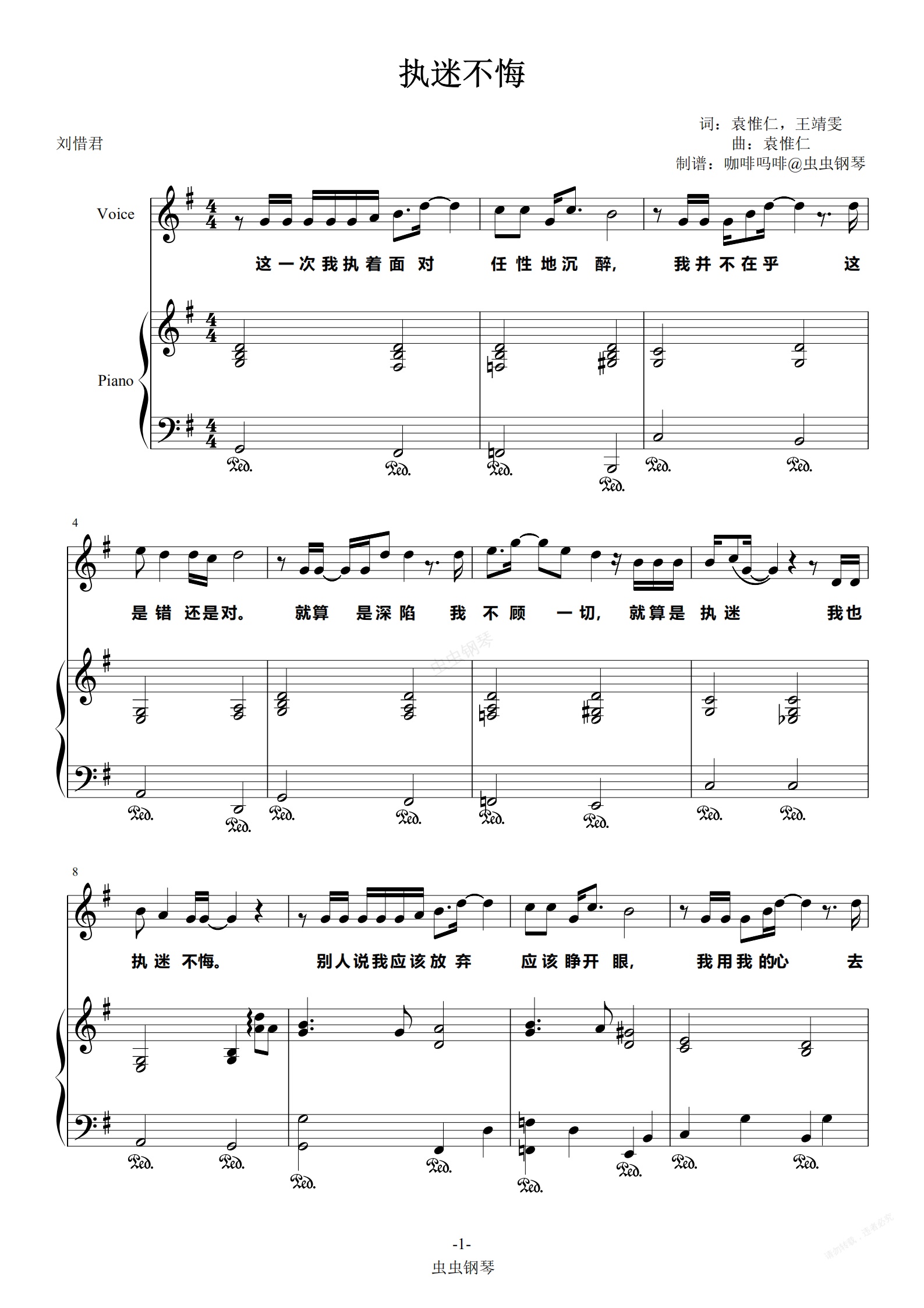 钢琴谱:执迷不悔-刘惜君 G调弹唱谱