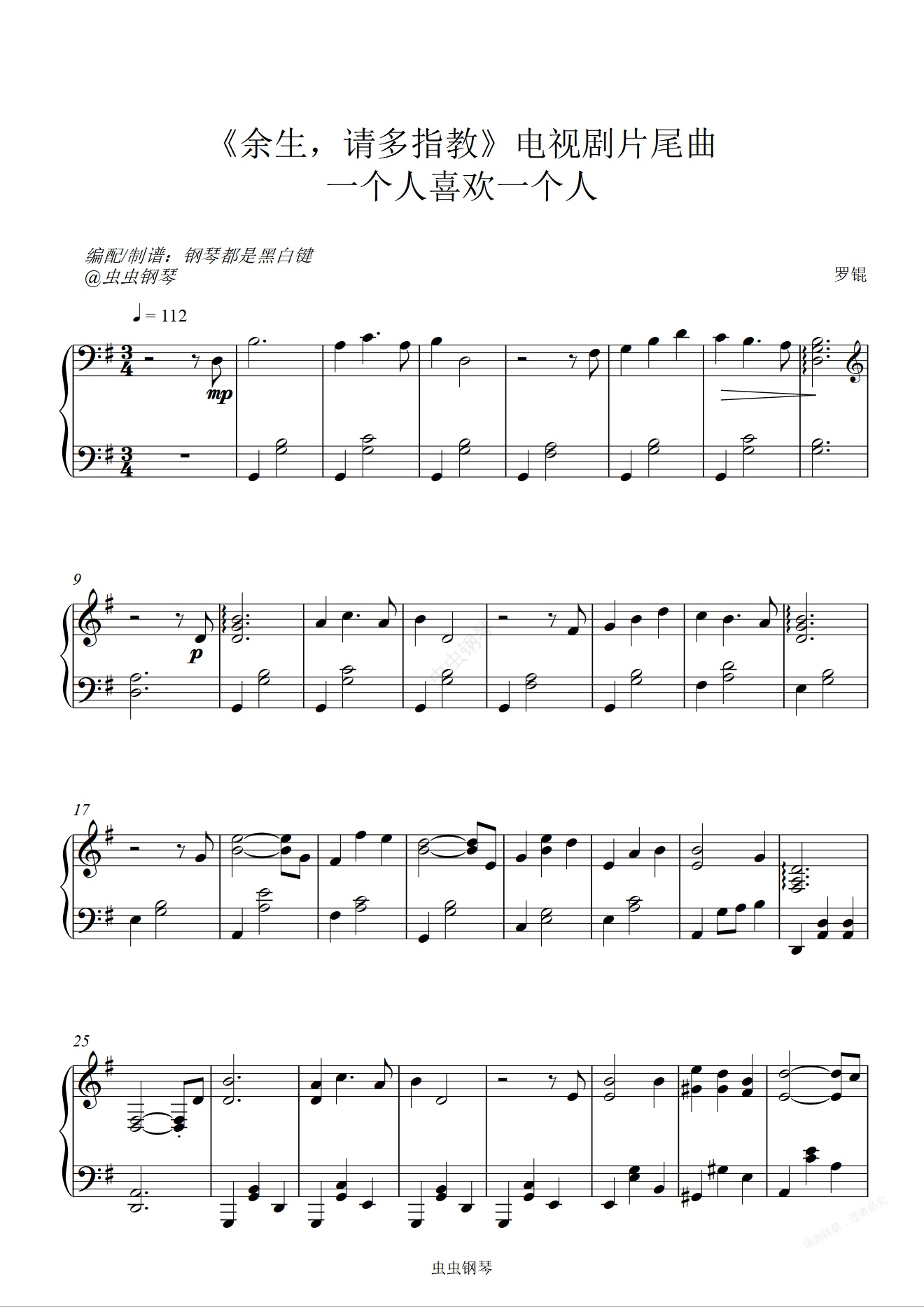 钢琴谱:一个人喜欢一个人-《余生,请多指教》电视剧片尾曲