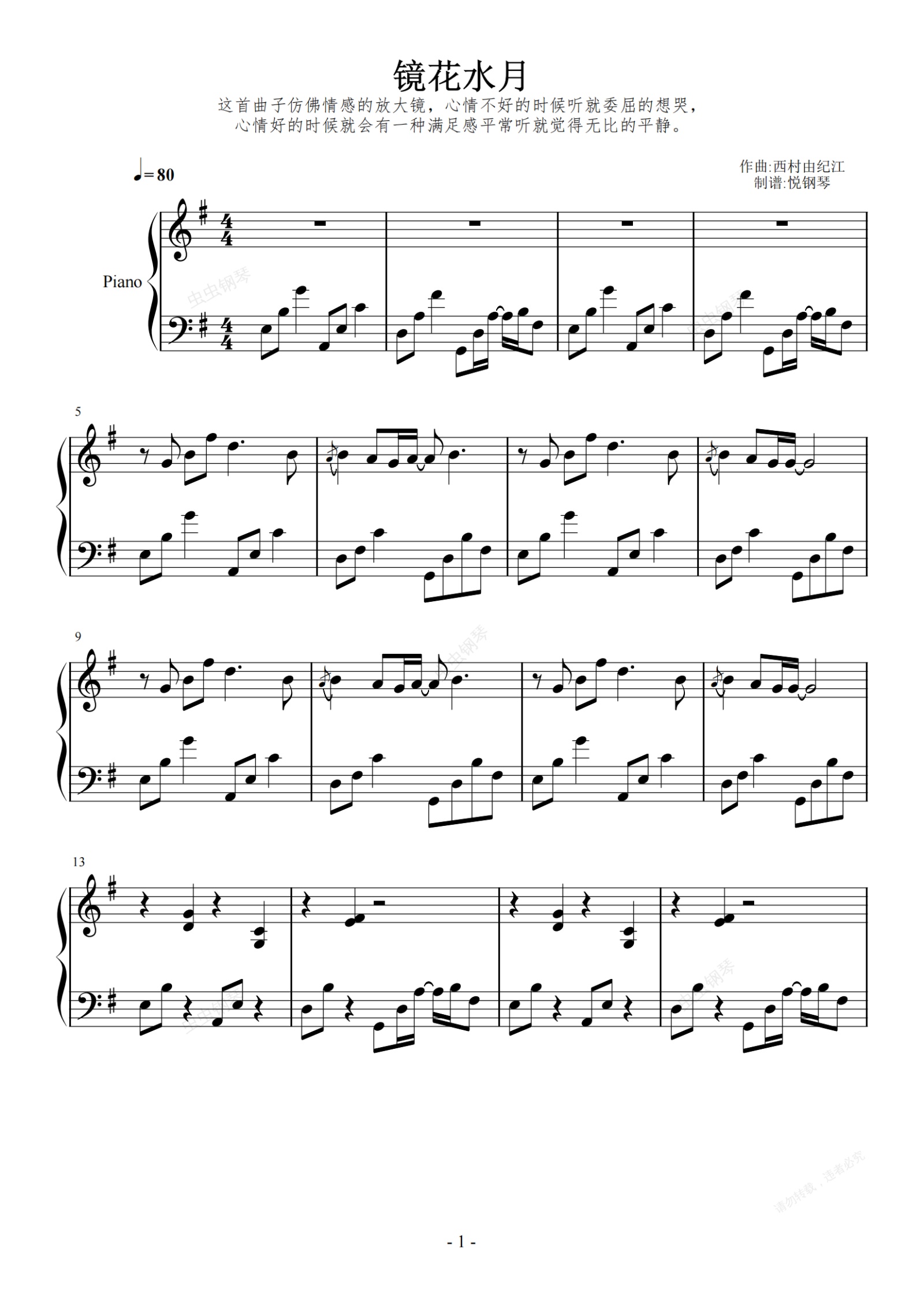 钢琴谱:镜花水月(原版谱面移高半音)西村由纪江