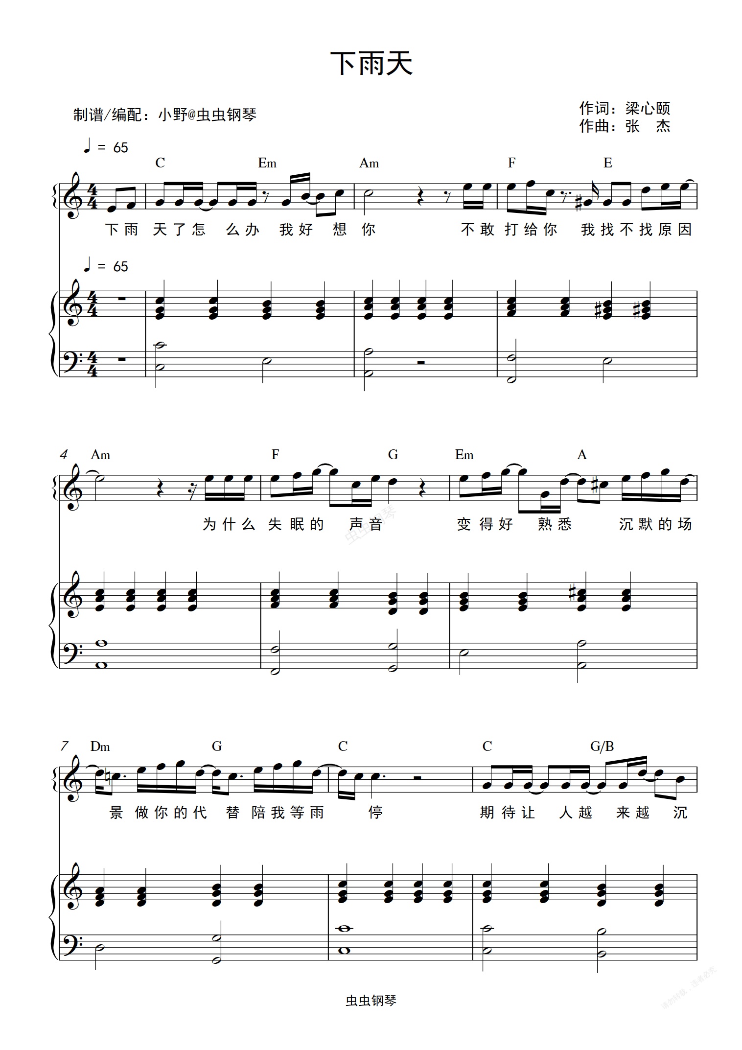 钢琴谱:下雨天(和弦弹唱版)
