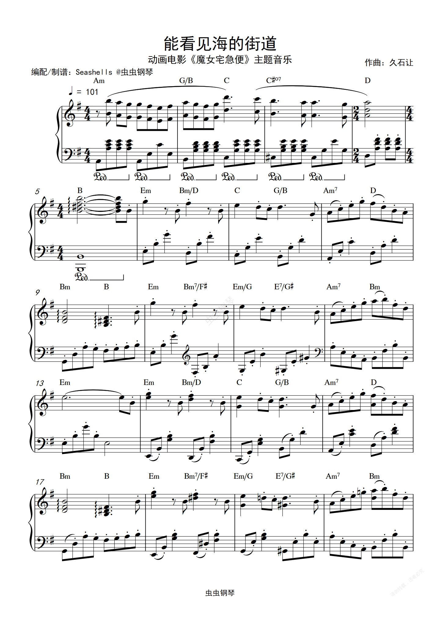 钢琴谱:久石让 - 《能看见海的街道》魔女宅急便主题音乐