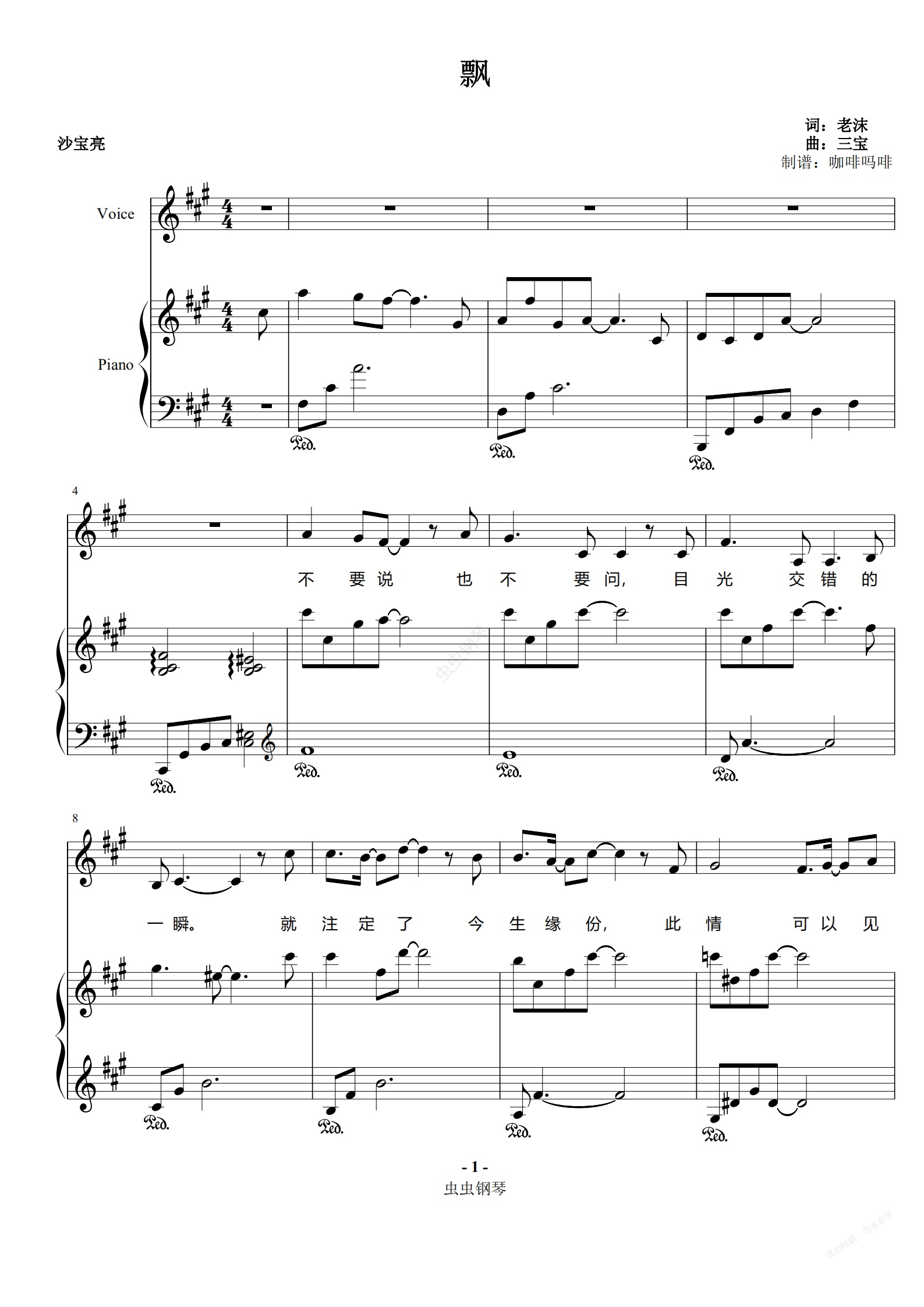 钢琴谱:飘-沙宝亮 钢琴伴奏谱