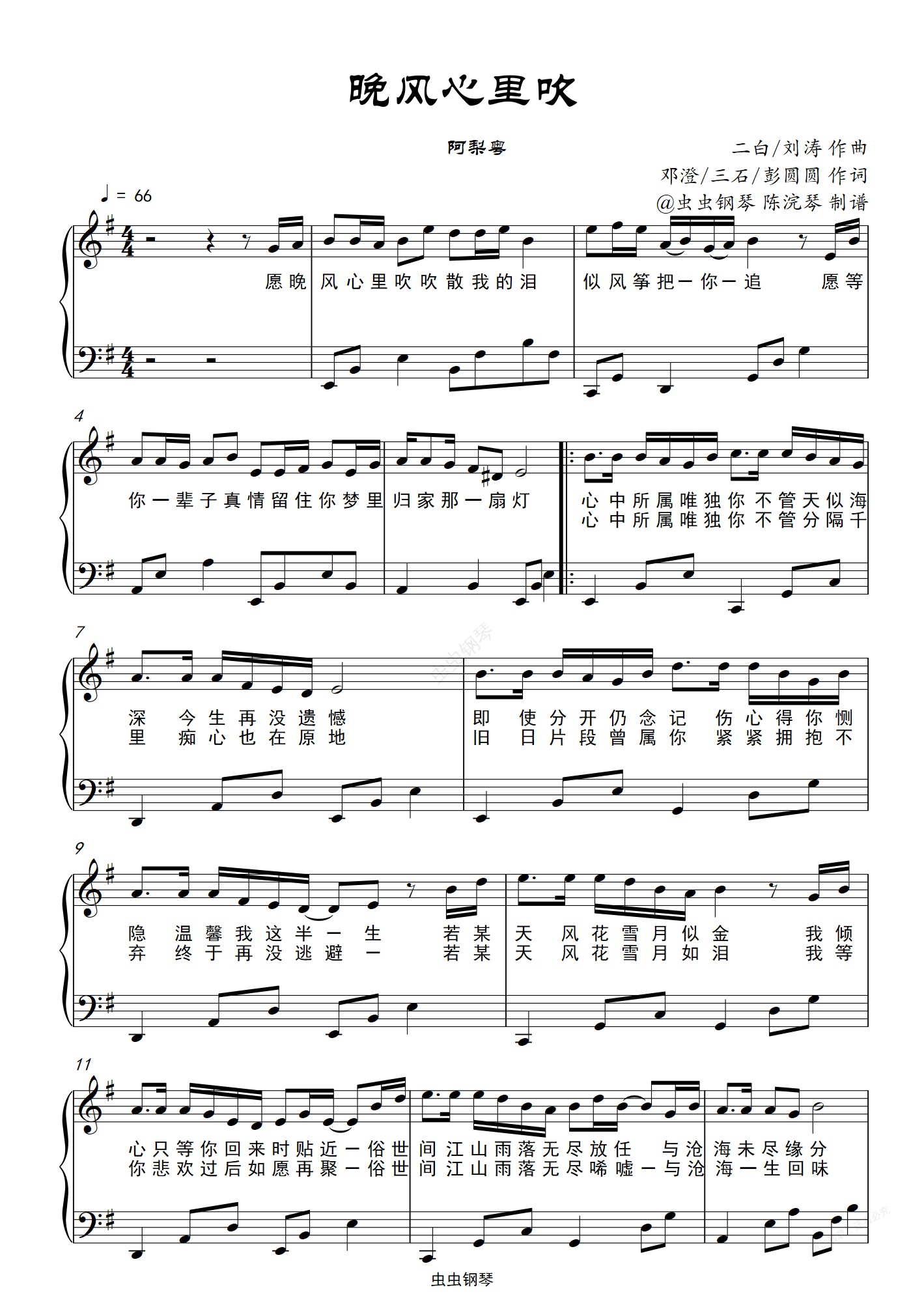 钢琴谱:晚风心里吹-G调钢琴谱【附带歌词】