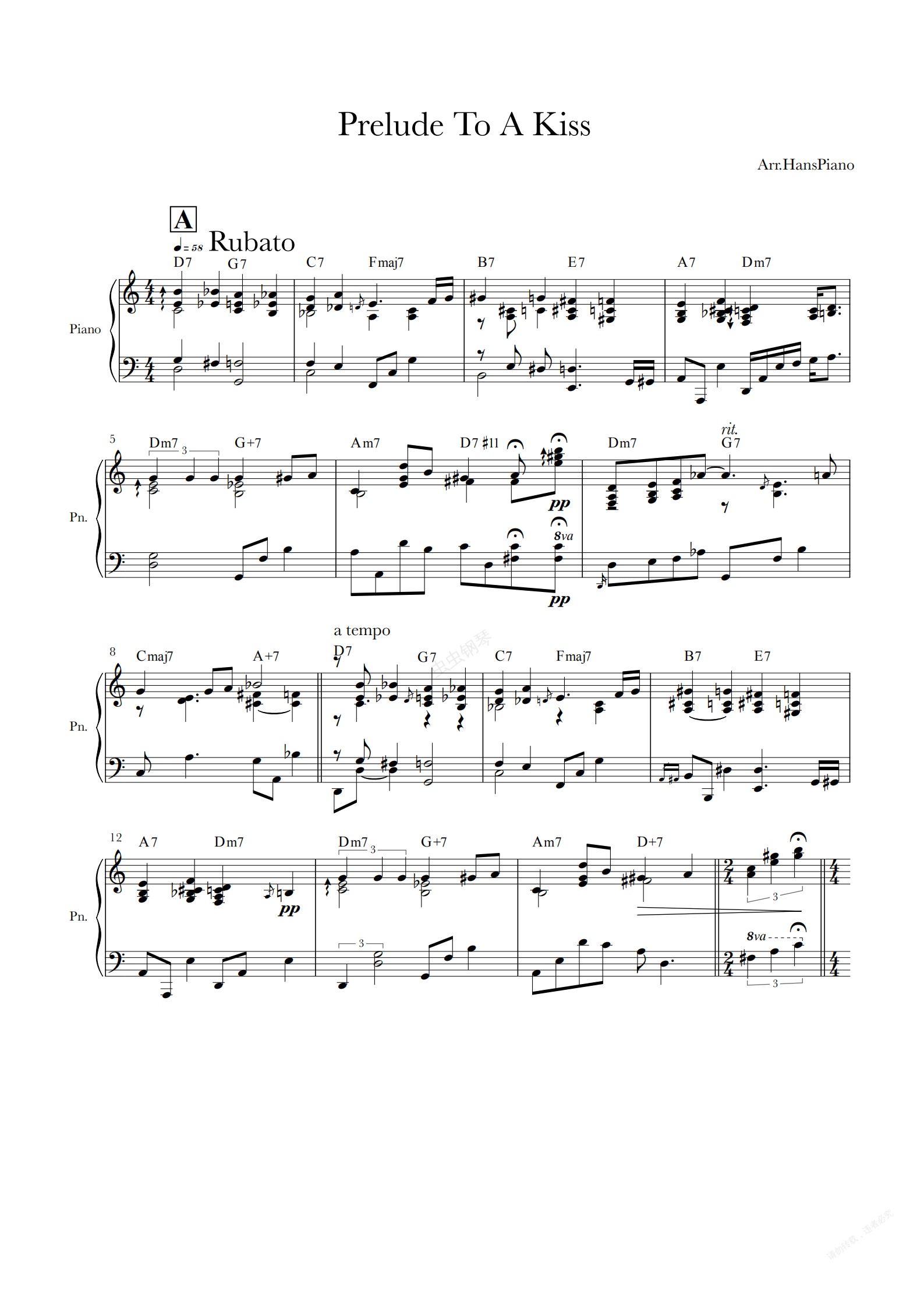 钢琴谱:Prelude To A Kiss【免费】【爵士标准曲】泽大大 Hans piano