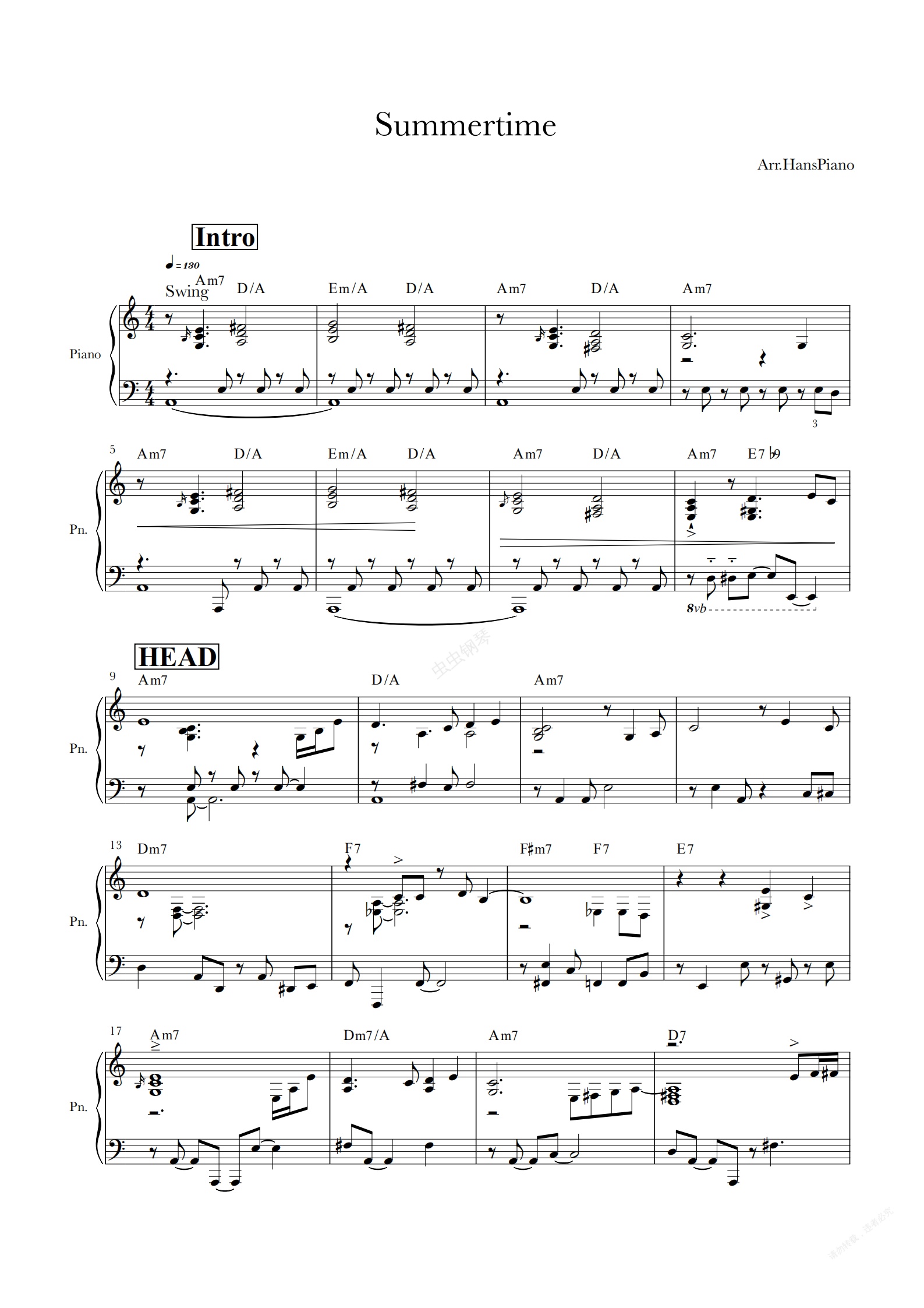 钢琴谱:Summertime【免费】【爵士标准曲】泽大大 Hans piano