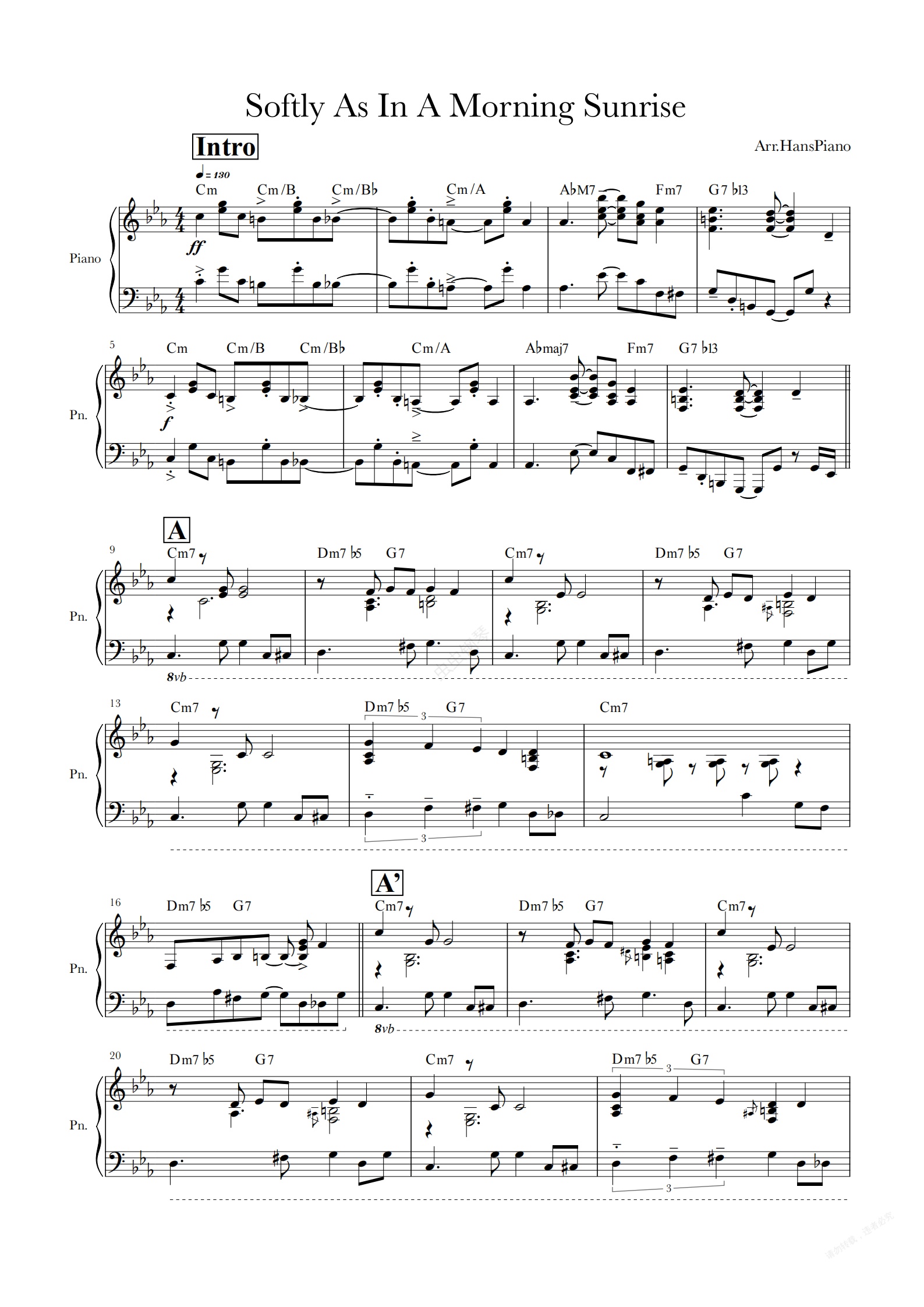 钢琴谱:Softly As A Morning Sunrise【免费】【爵士标准曲】泽大大 Hans piano