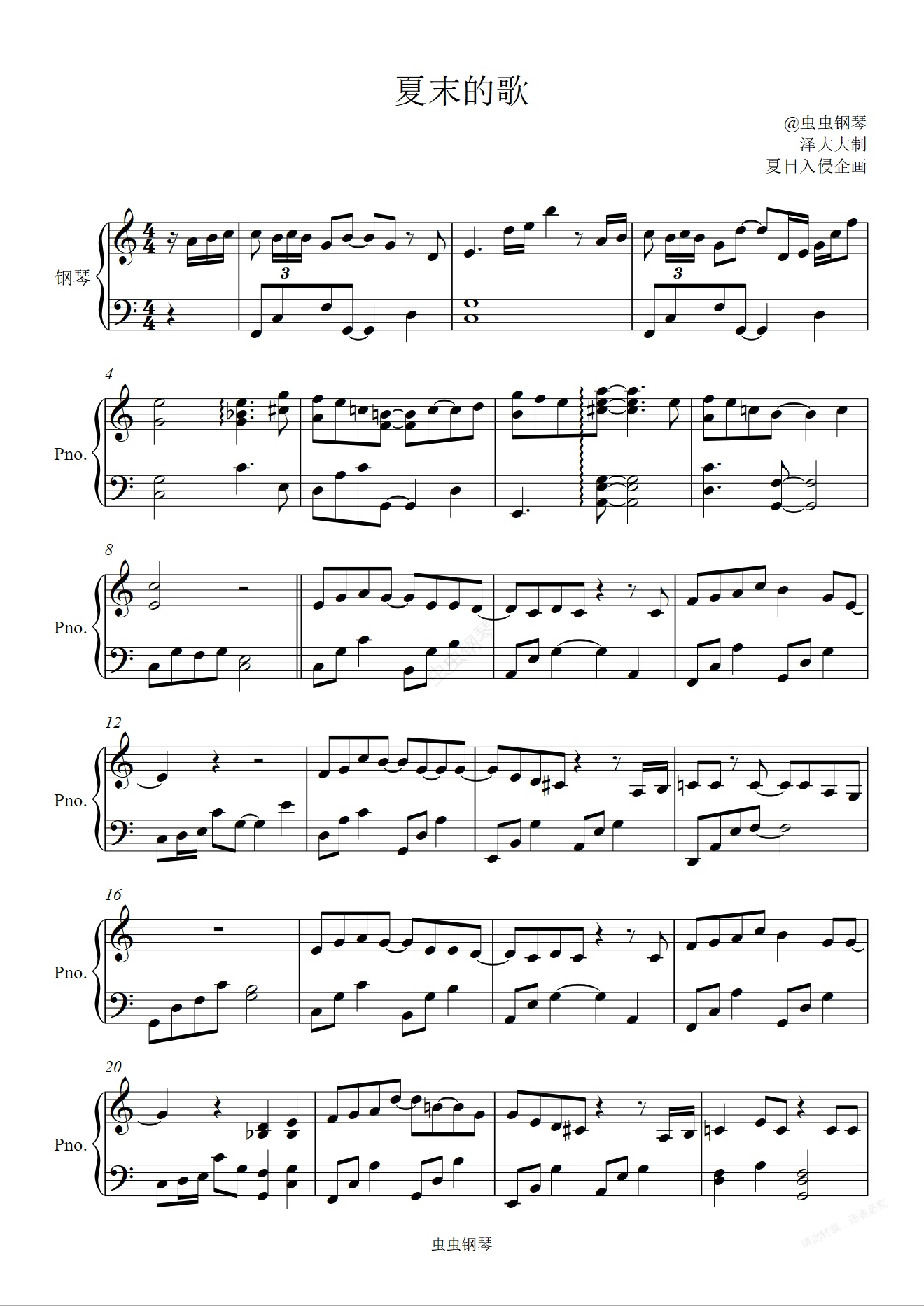 钢琴谱:夏末的歌【C调独奏版】泽大大 夏日入侵企画