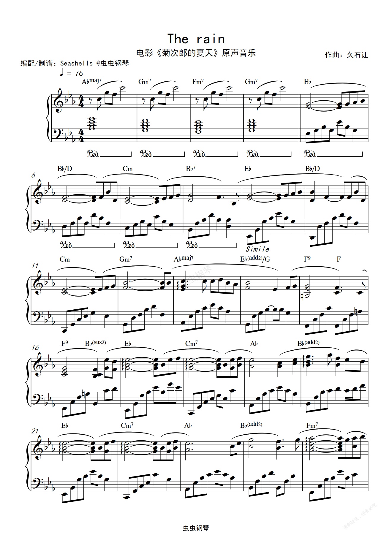 钢琴谱:久石让 - 《The rain》钢琴独奏 菊次郎的夏天配乐