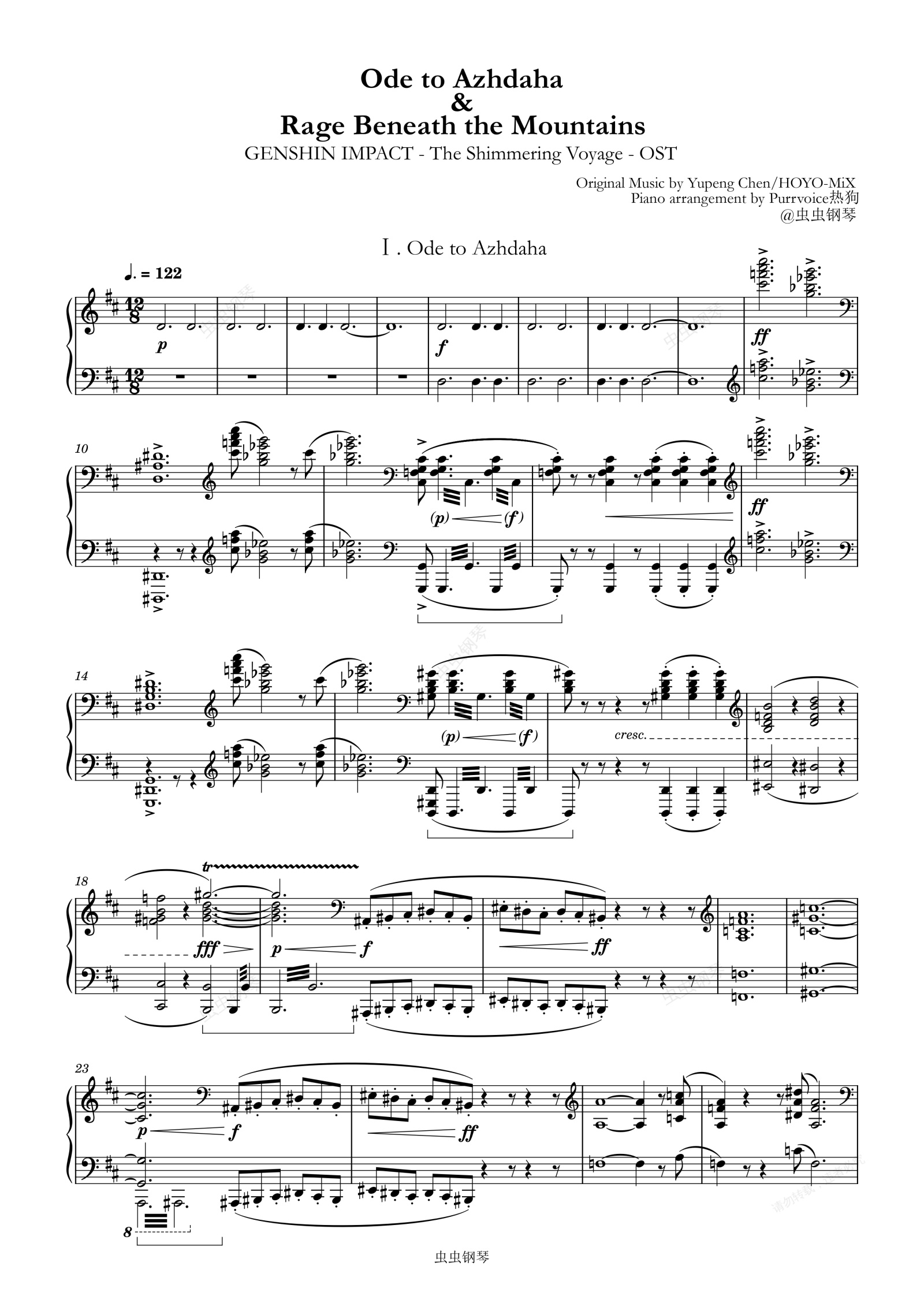 大家好我是热狗,本次带来的是原神中的BOSS若陀龙王的战斗bgm钢琴改编,共有两阶段,一阶段名为《天遒歌》,二阶段名为《岩壑之崩》,其中二阶段是我目前原神中最喜欢的ost。此次附带的试听也是和原曲的混音版本,纯钢琴版本请移步至我的B站视频主页:/ 搜索关键词“若陀龙王”观看相应的视频。