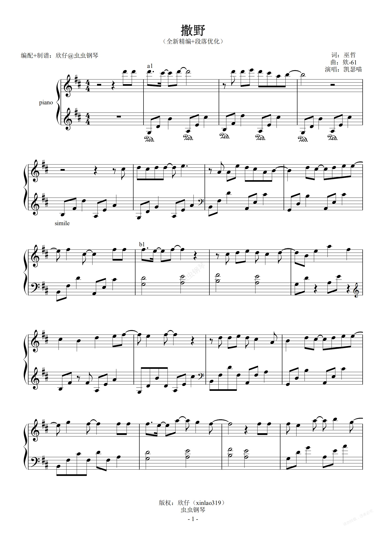 钢琴谱:凯瑟喵-D《撒野》(全新精编+段落优化)