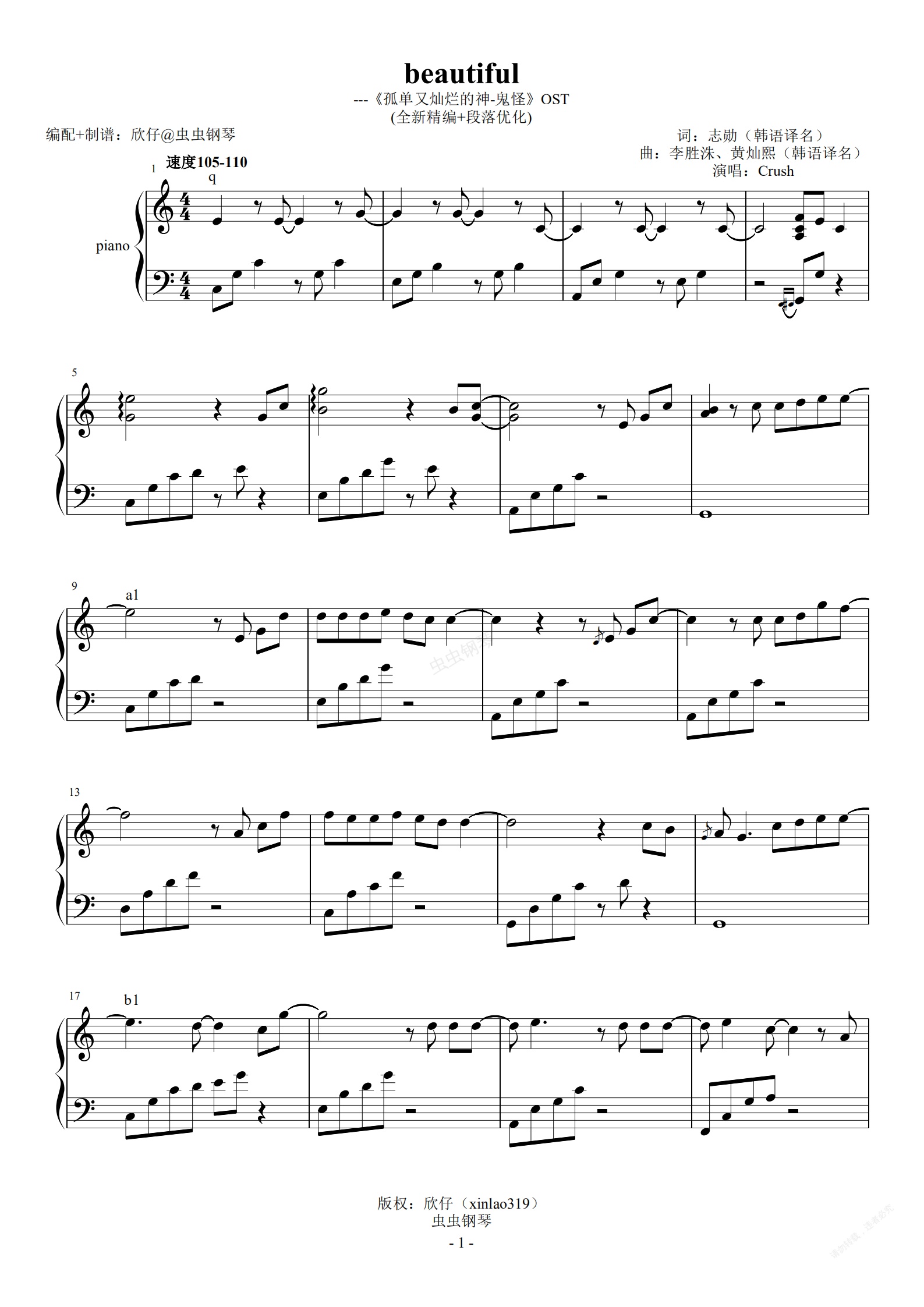 钢琴谱:C-《Beautiful》(《鬼怪》OST、全新精编+段落优化)