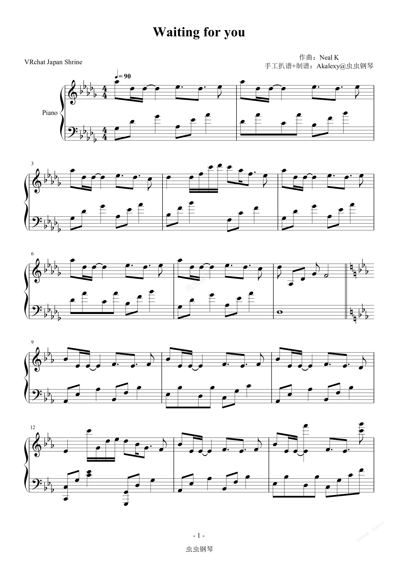 钢琴谱:VRchat《Waiting for you》