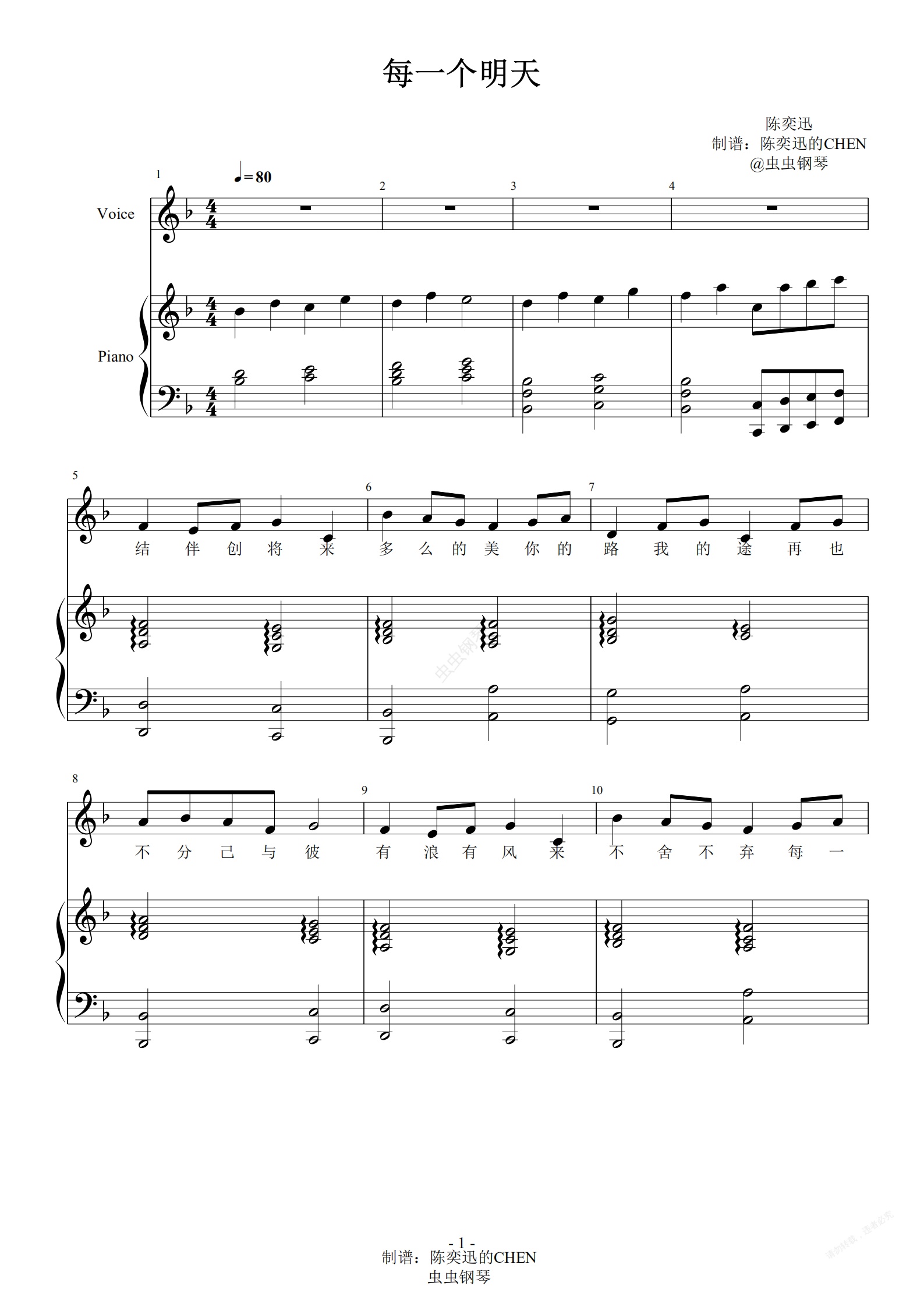 钢琴谱:每一个明天 完美弹唱谱【附歌词】