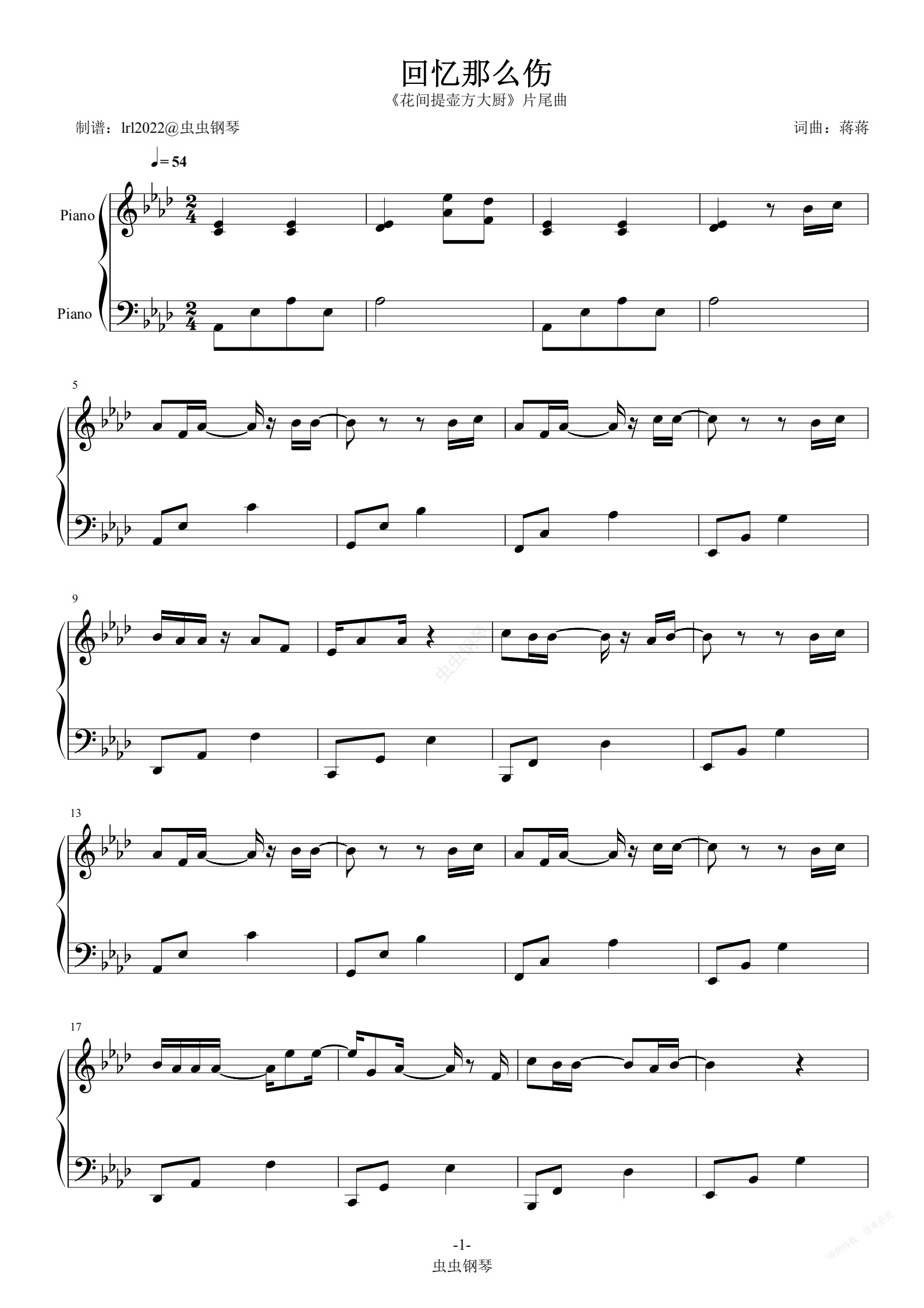 钢琴谱:回忆那么伤-《花间提壶方大厨》片尾曲-钢琴谱-独奏版