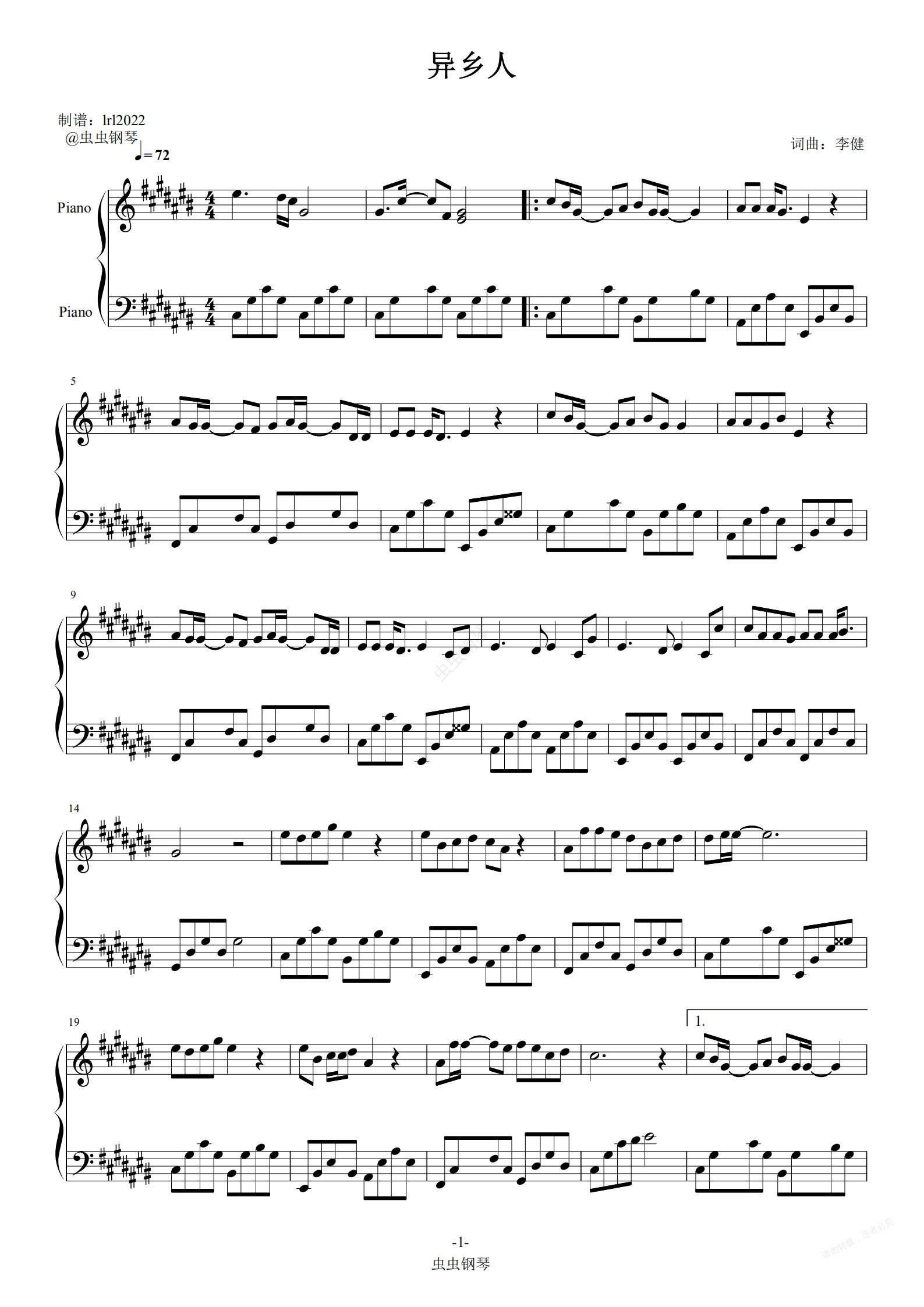钢琴谱:异乡人-李健-钢琴谱-独奏版