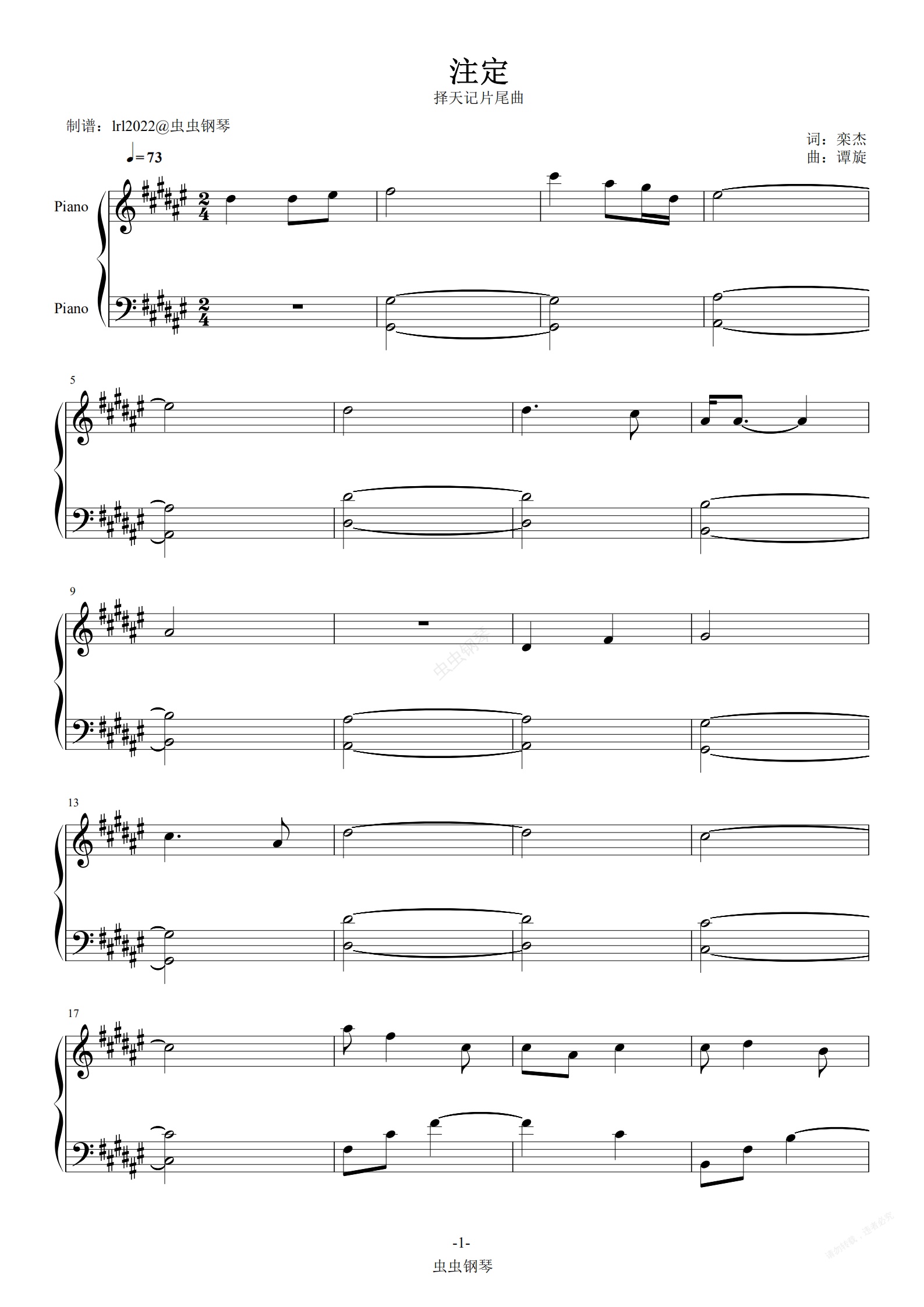 钢琴谱:注定-择天记片尾曲-钢琴谱-独奏版-周笔畅&白举纲