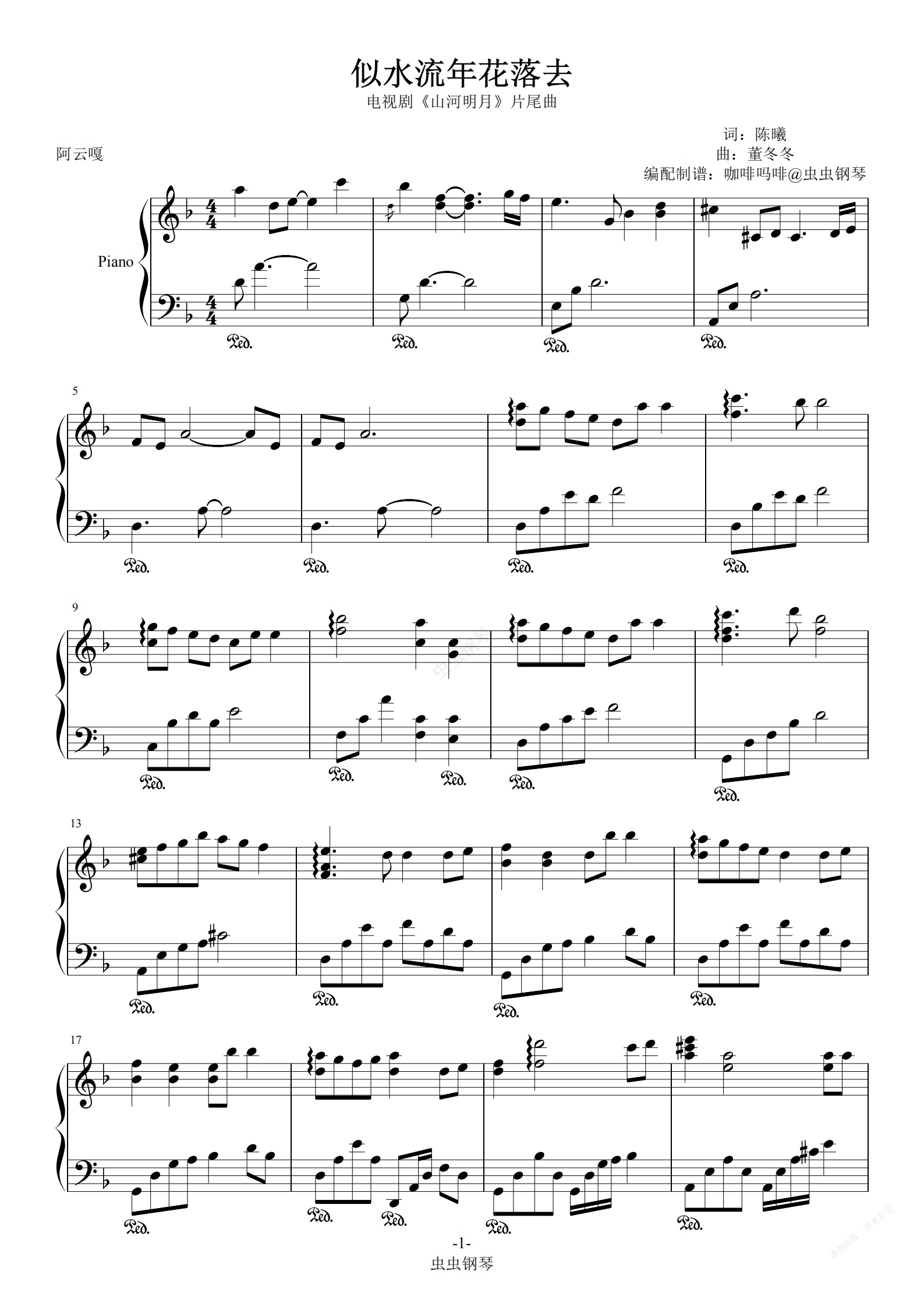 钢琴谱:似水流年花落去-《山河明月》阿云嘎 F调钢琴谱