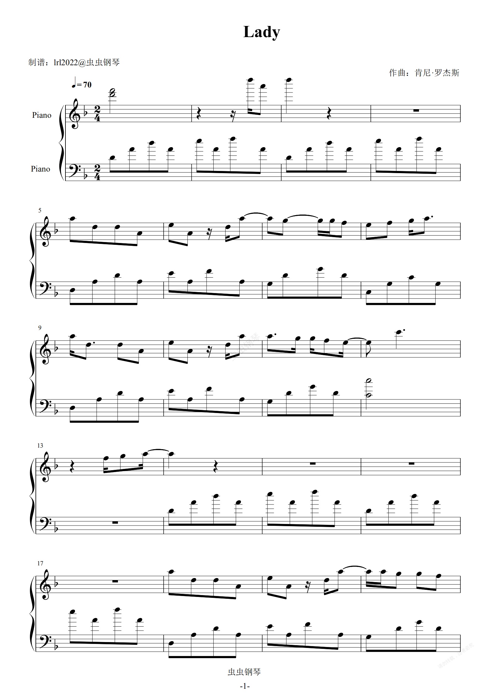 钢琴谱:Lady-肯尼·罗杰斯-Kenny Rogers-肯尼·罗杰斯-独奏五线谱
