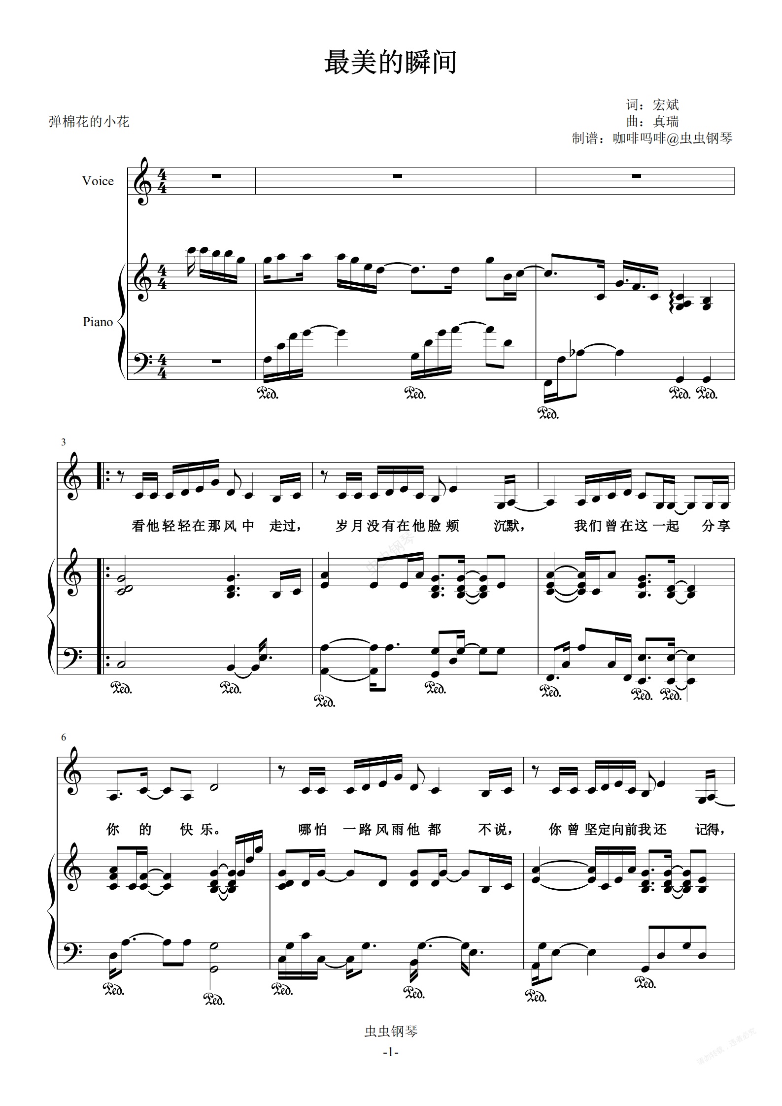 钢琴谱:最美的瞬间(女生版)-弹棉花的小花 C调伴奏谱