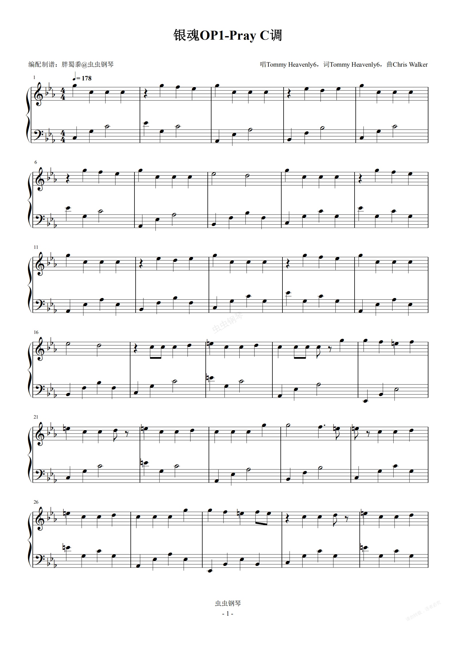 钢琴谱:银魂OP1-Pray C调 旋律超还原