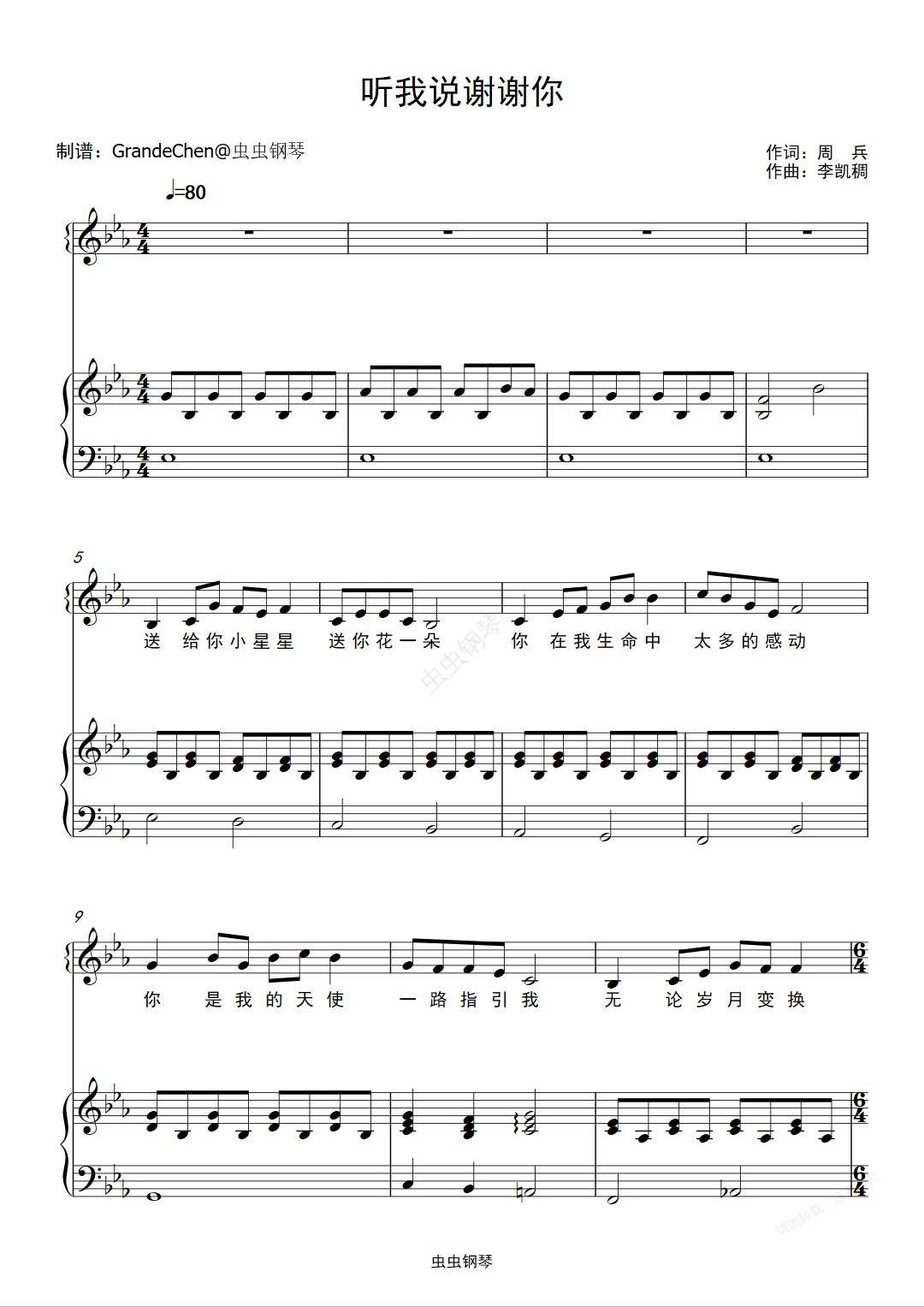 钢琴谱:听我说谢谢你 简易弹唱伴奏谱
