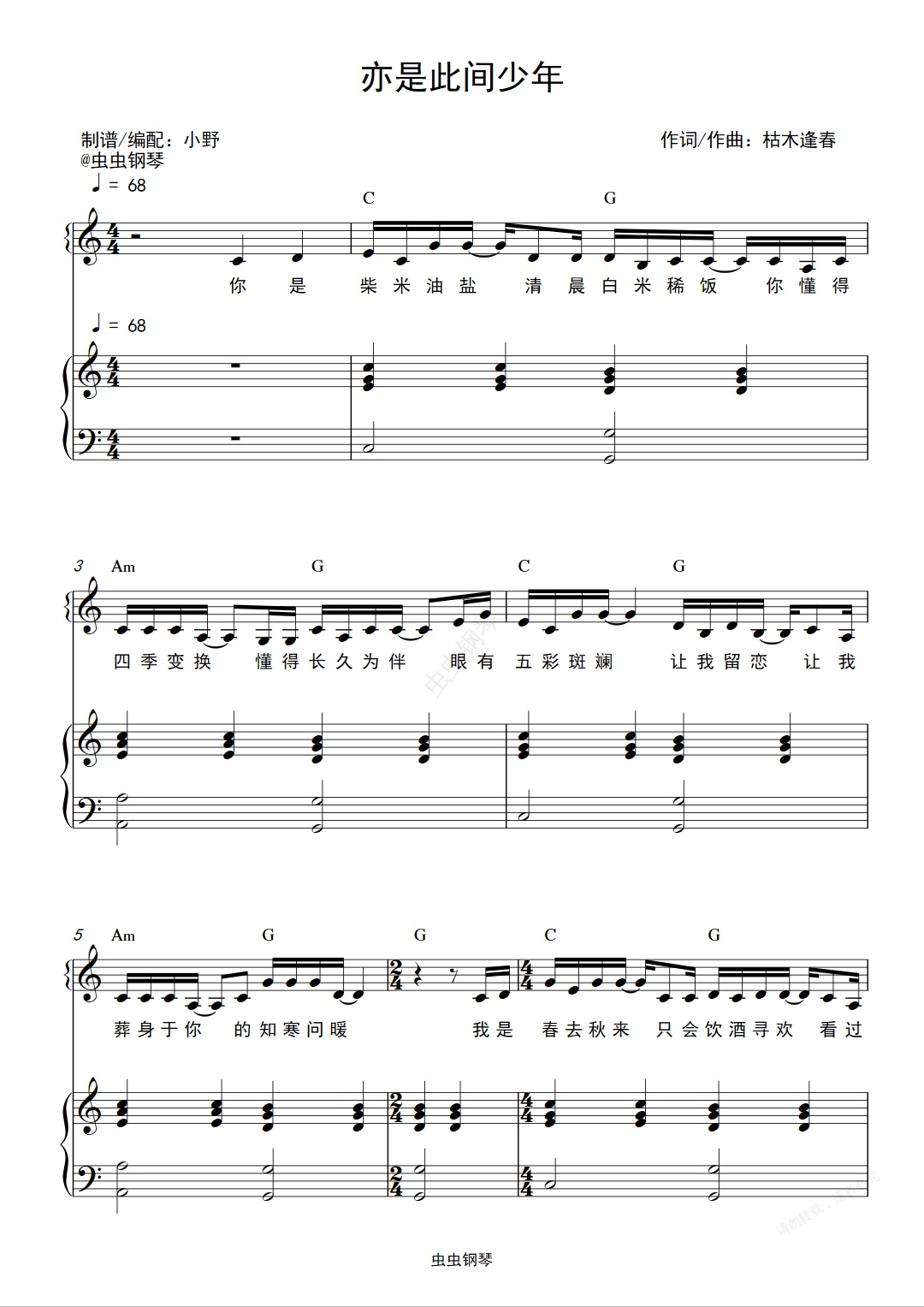 钢琴谱:亦是此间少年(和弦弹唱版)
