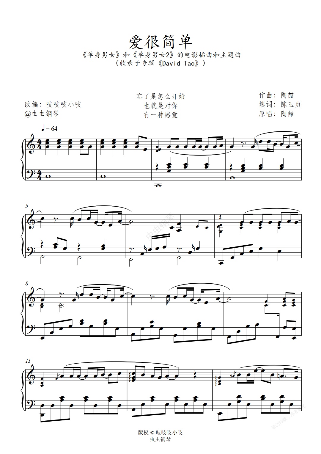 钢琴谱:爱很简单 C调 陶喆 《单身男女》和《单身男女2》的电影插曲和主题曲