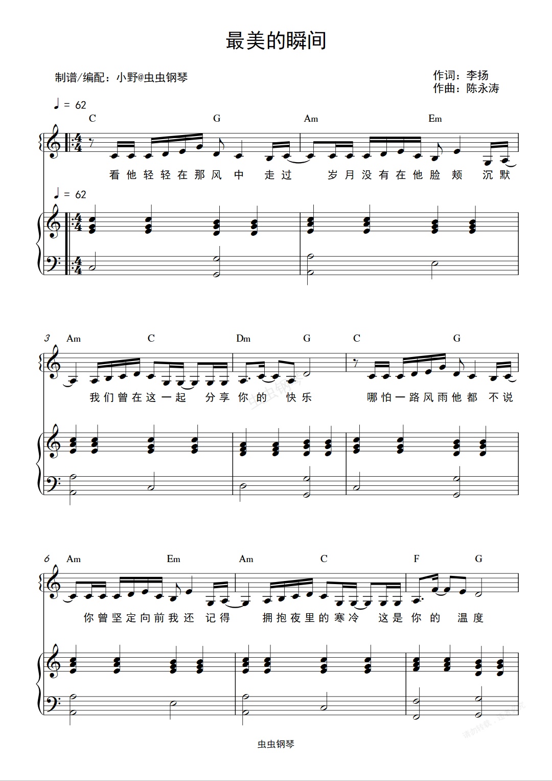 钢琴谱:最美的瞬间(和弦弹唱版)