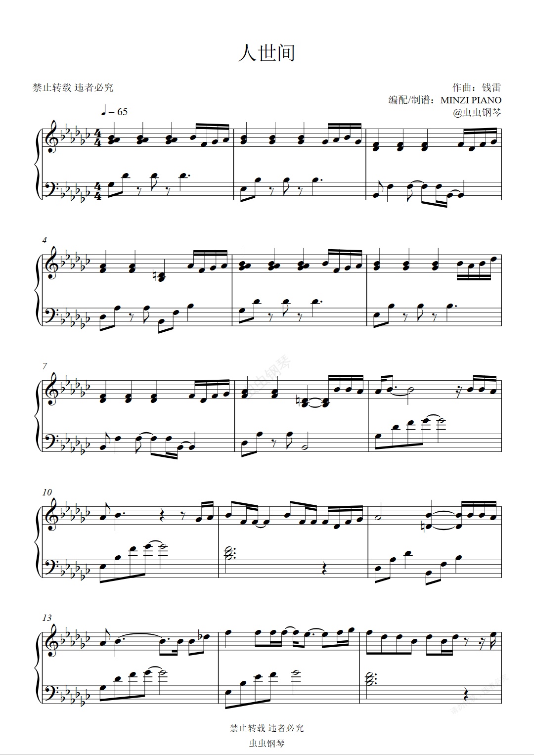 钢琴谱:雷佳《人世间》原调 好听易弹