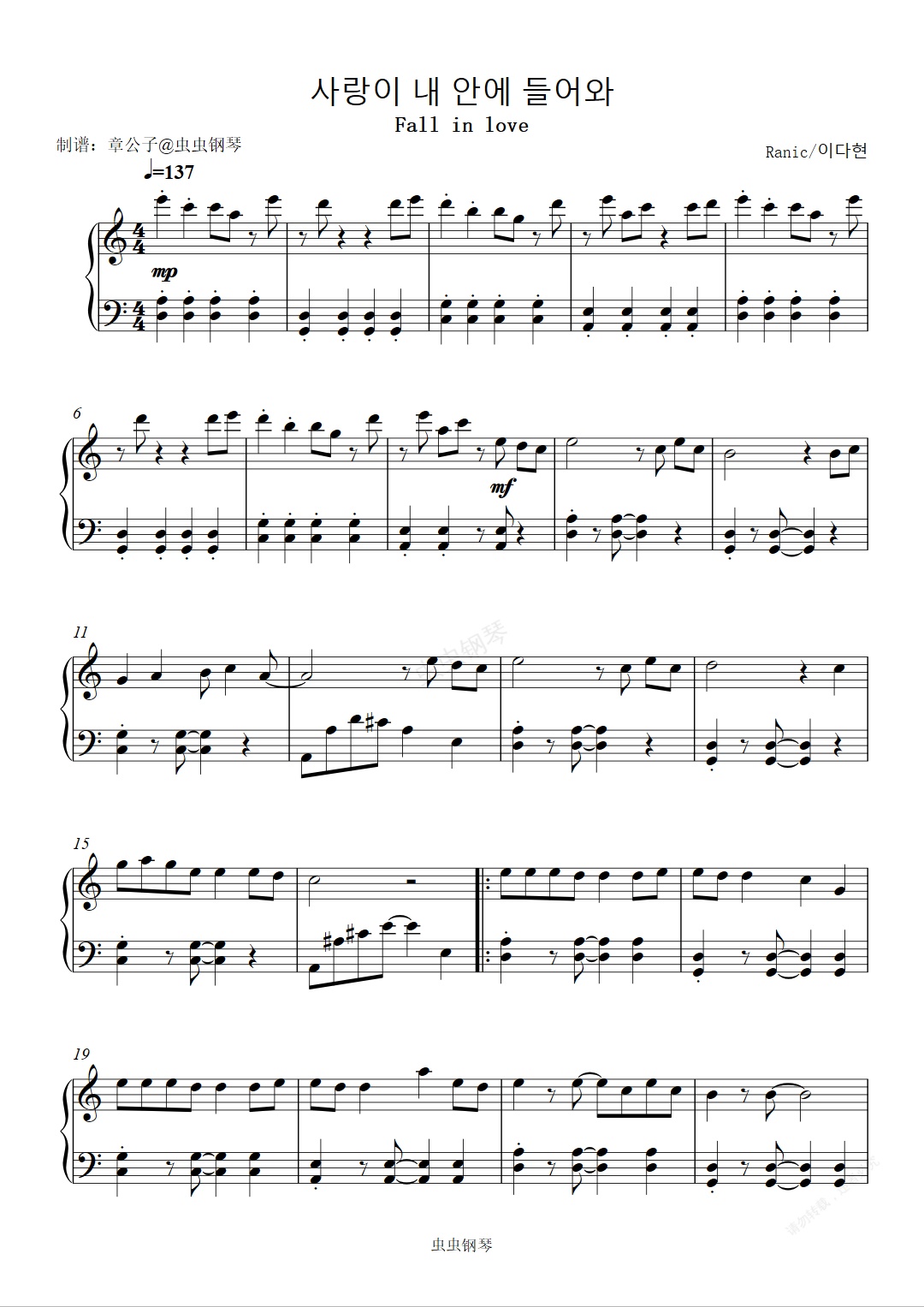 钢琴谱:사랑이 내 안에 들어와 (Fall In Love) 《社内相亲》插曲 - 钢琴独奏谱
