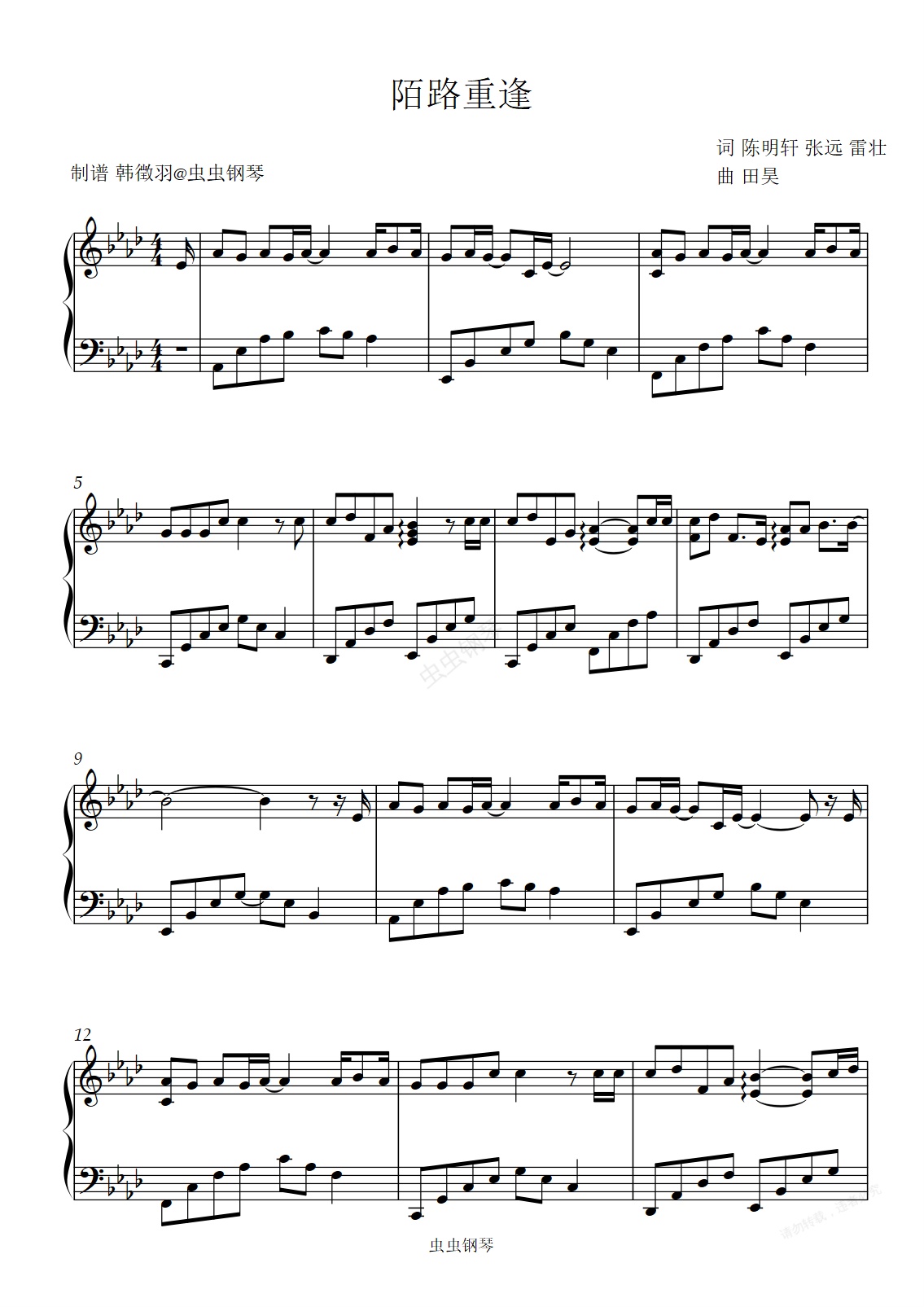 钢琴谱:陌路重逢 张远 降A 简单易弹