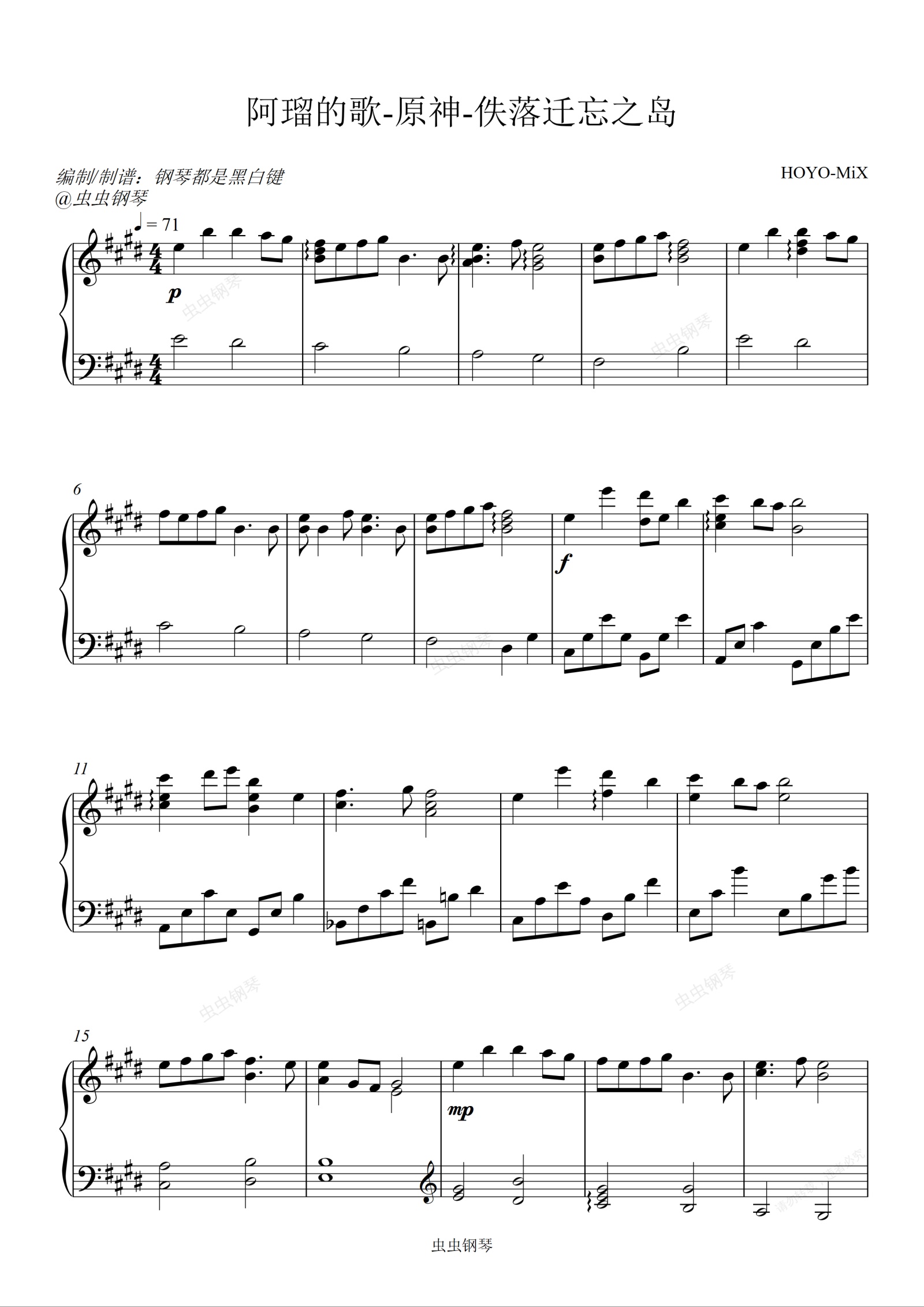 钢琴谱:原神- 阿瑠的歌 佚落迁忘之岛