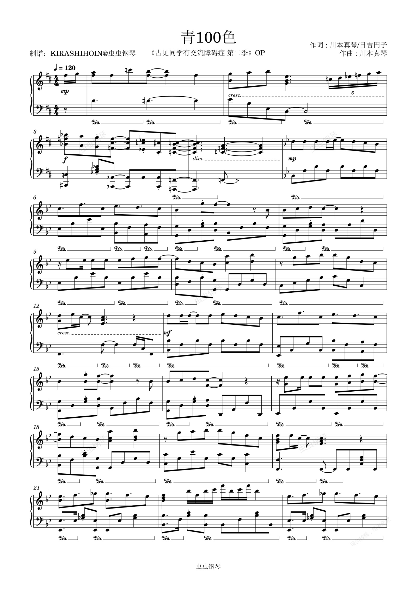 钢琴谱:青100色(《古见同学有交流障碍症 第二季》OP/片头曲)- 伊藤美来