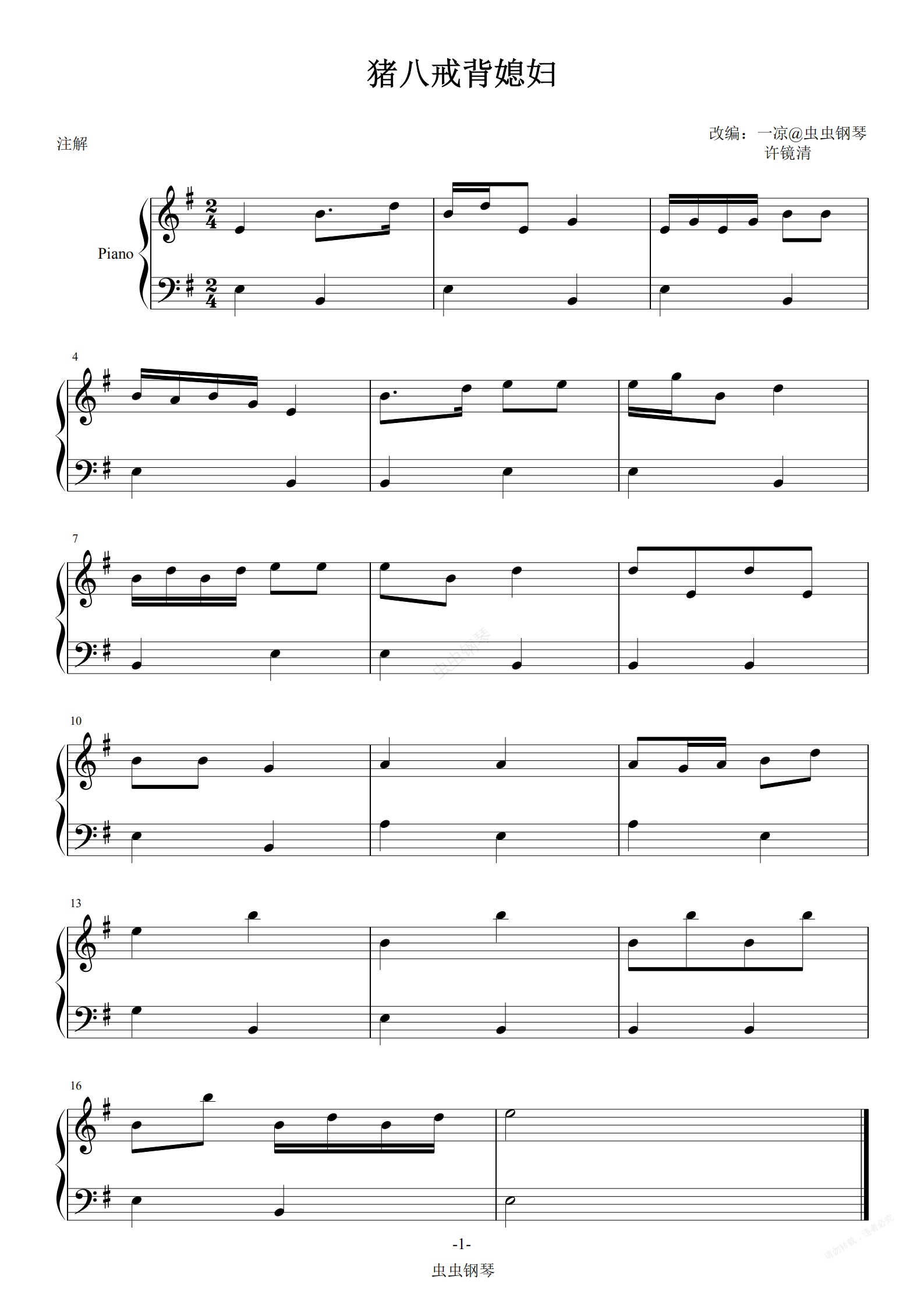 钢琴谱:猪八戒背媳妇 G调简单版