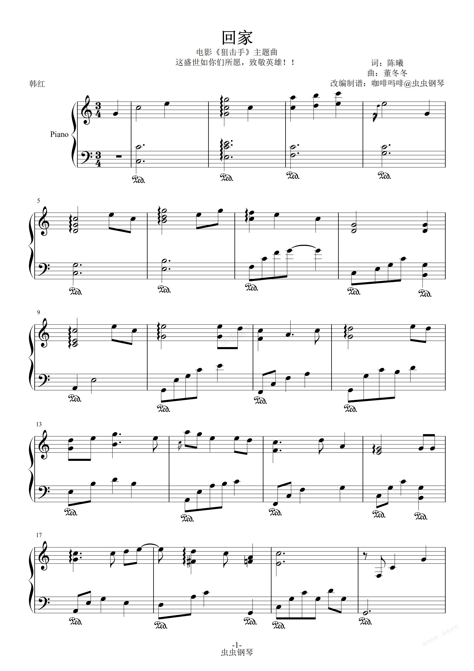 钢琴谱:回家-电影《狙击手》主题曲 C调独奏谱