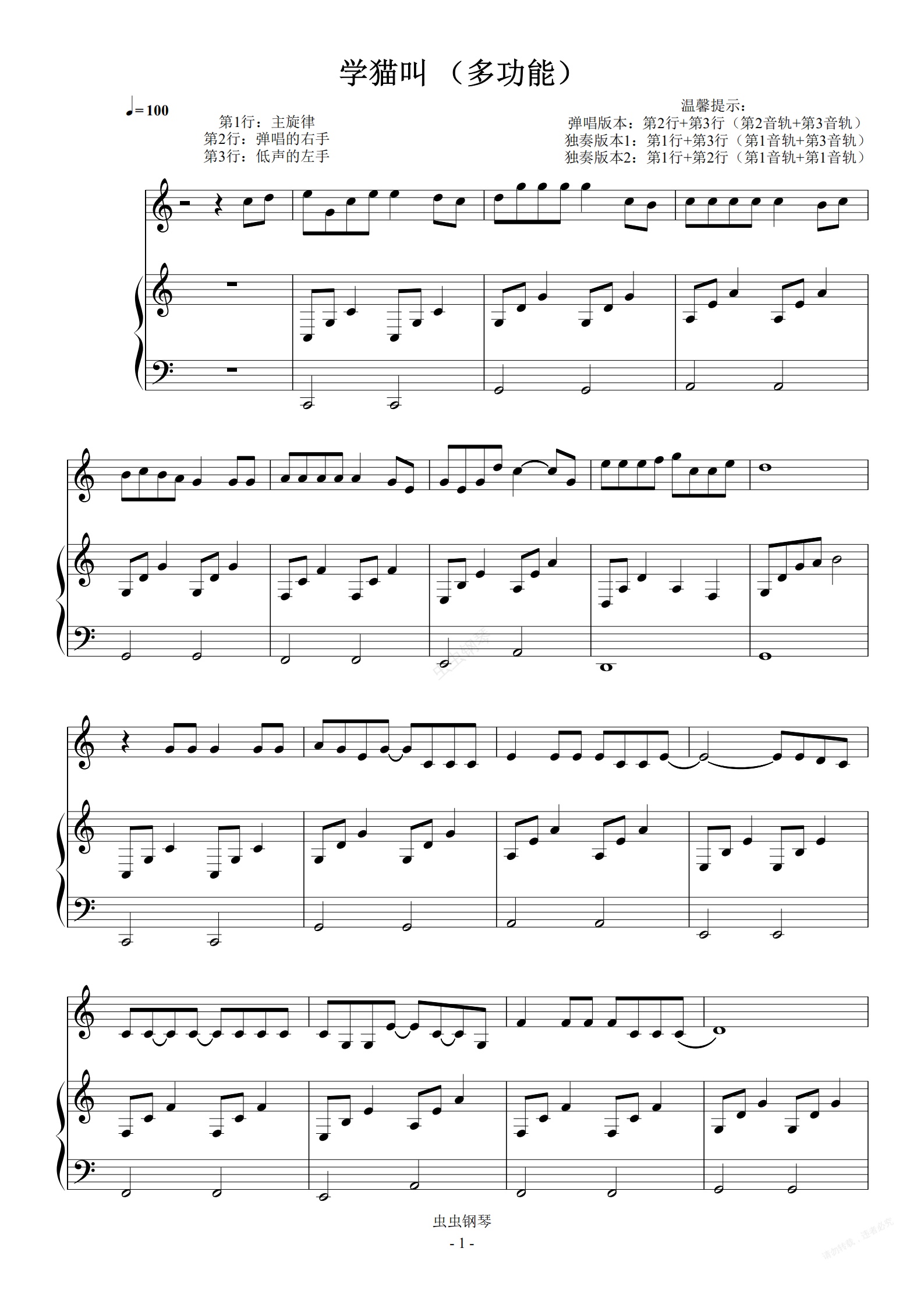 钢琴谱:学猫叫 C调 弹唱+独奏 简易(小汤2)