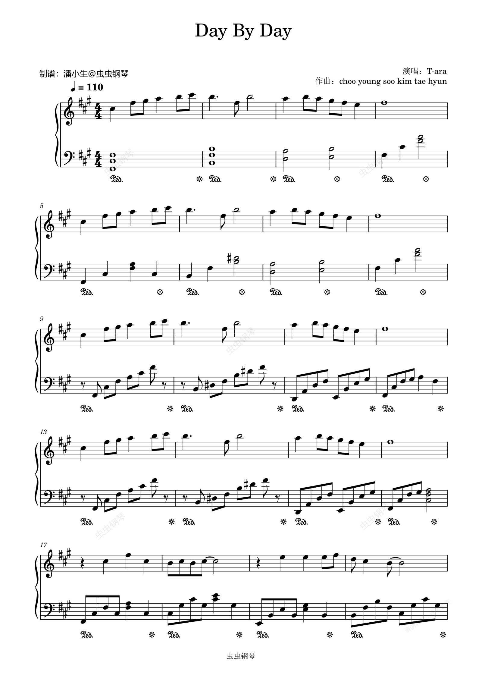 钢琴谱:DAY BY DAY 钢琴五线谱 T-ara 带踏板提示 A大调
