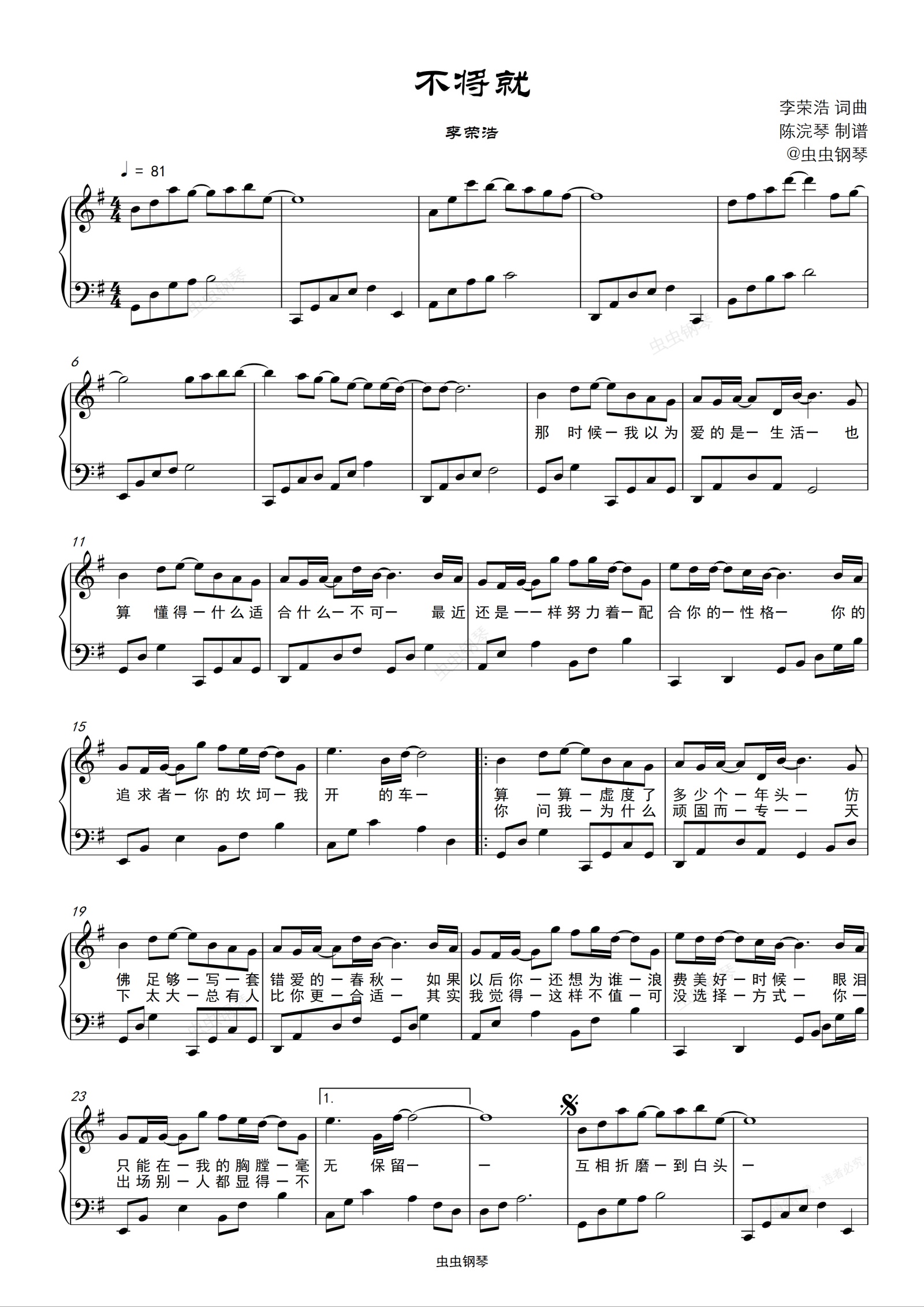 钢琴谱:不将就-G调钢琴谱【附歌词】