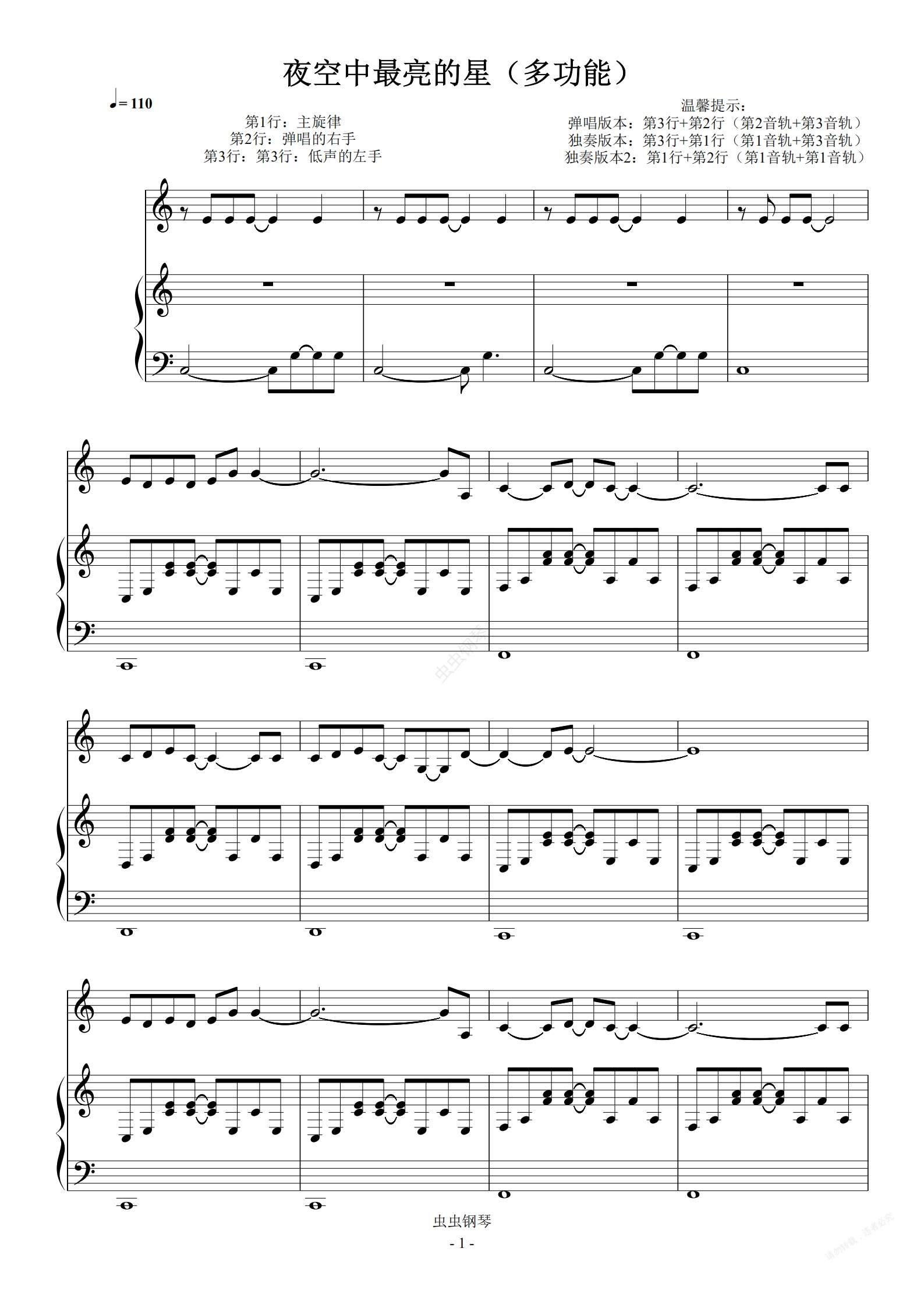 钢琴谱:夜空中最亮的星 C调 弹唱+独奏 简易(小汤3)