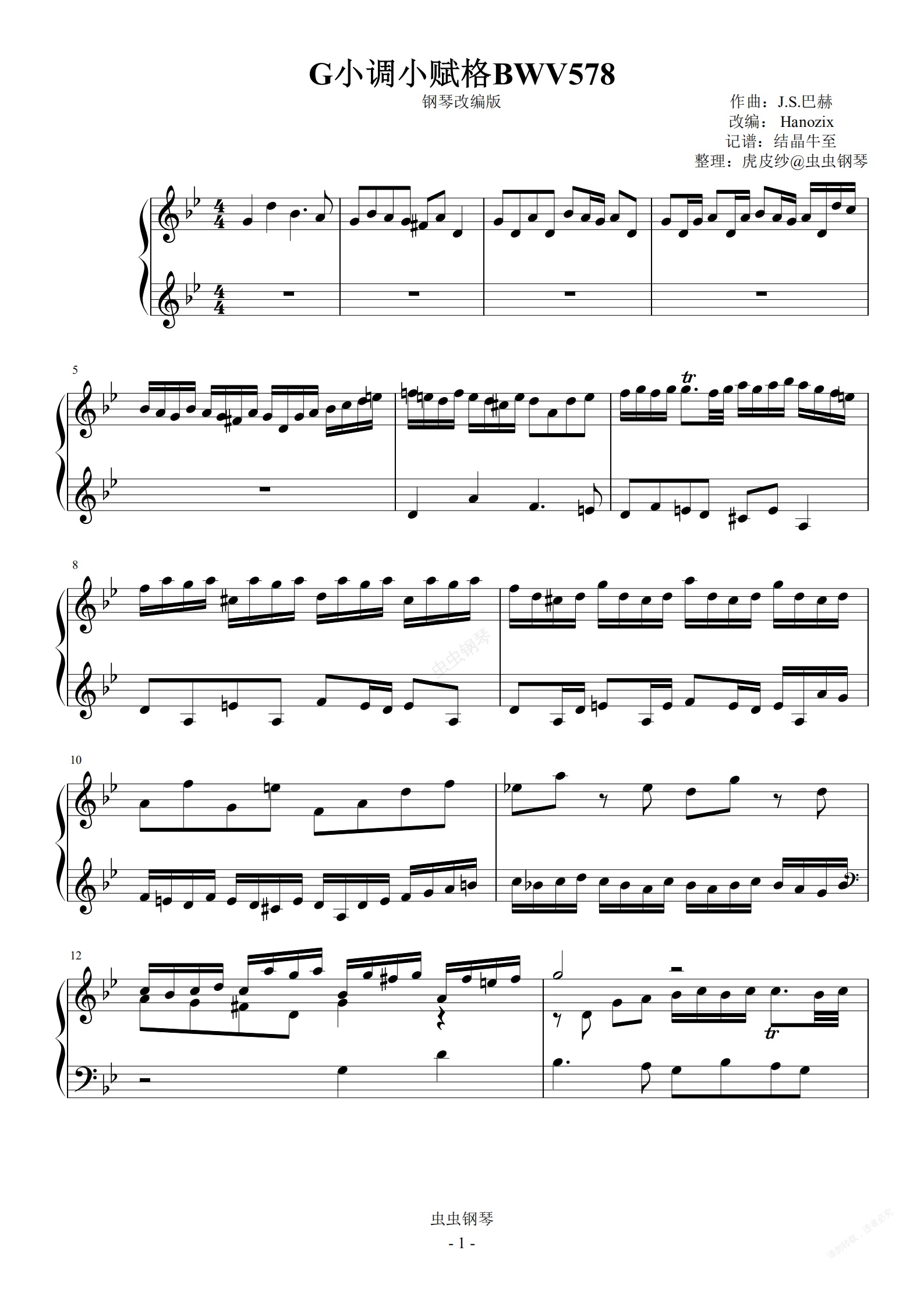 钢琴谱:巴赫G小调小赋格BWV578 钢琴改编版(原管风琴)