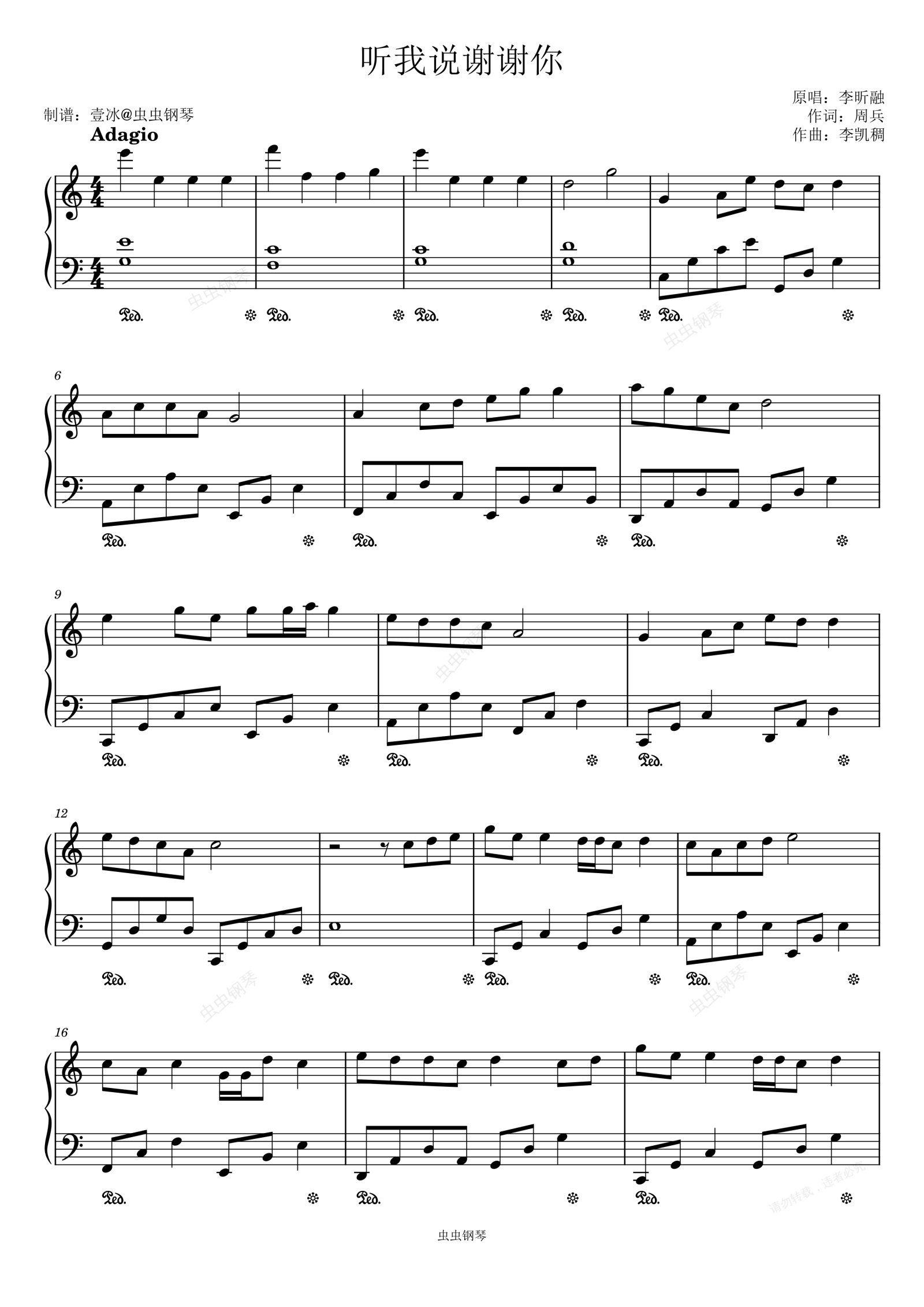 钢琴谱:听我说谢谢你//李昕融-C调 简单易上手