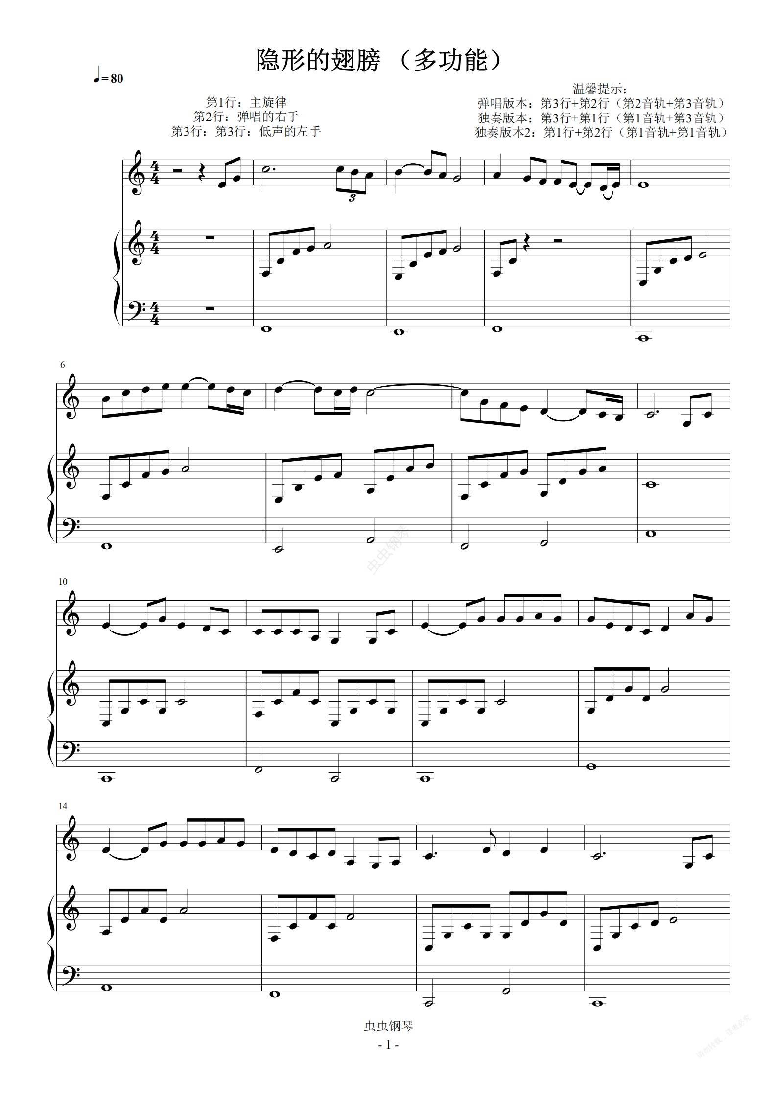 钢琴谱:隐形的翅膀 C调 弹唱+独奏 简易(小汤)