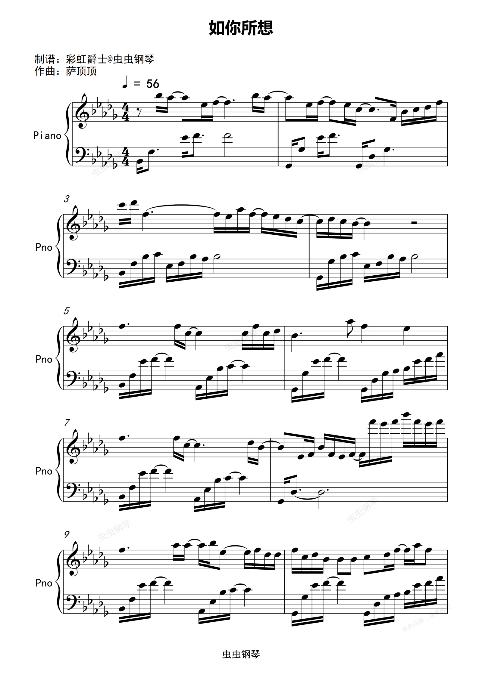 钢琴谱:如你所想 毛不易 萨顶顶 简单版