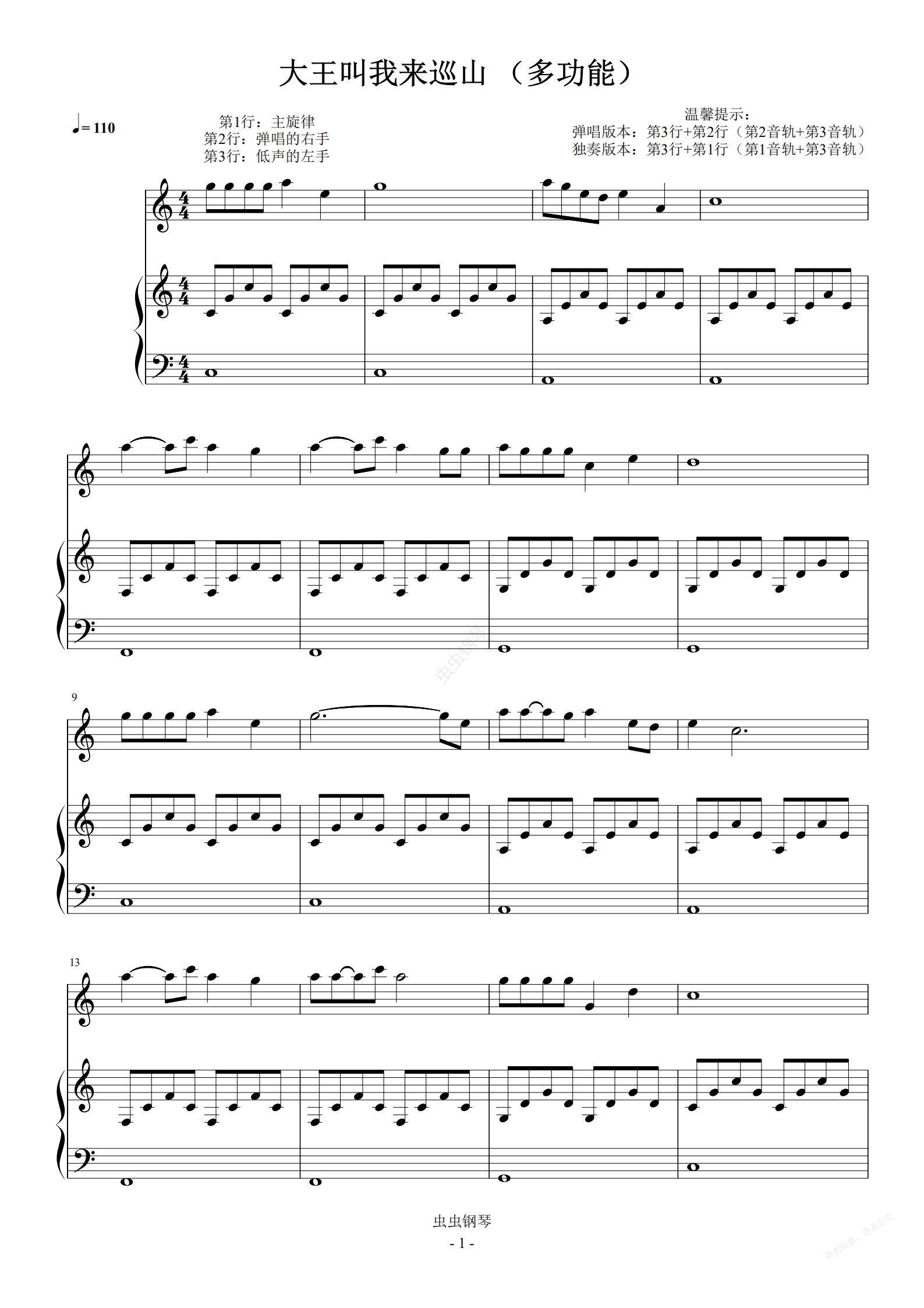 钢琴谱:大王叫我来巡山 C 调 弹唱+独奏 简易(小汤)